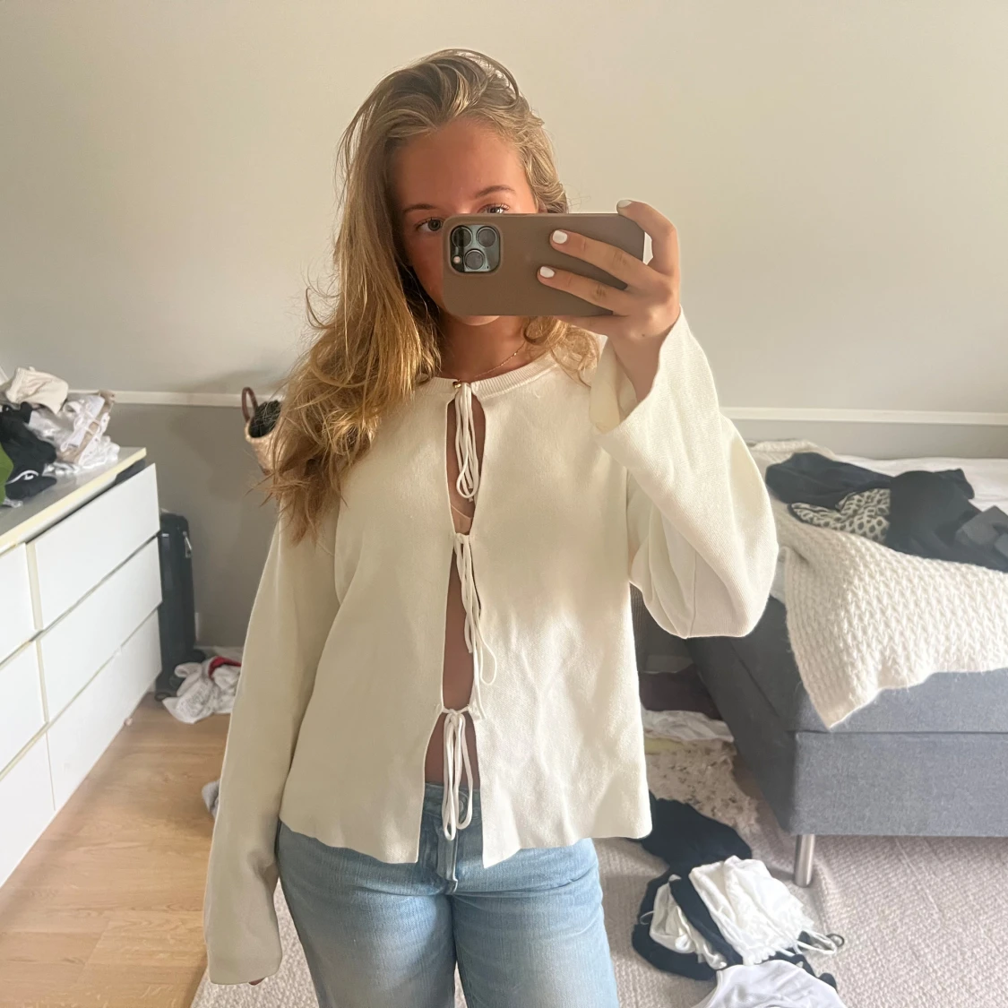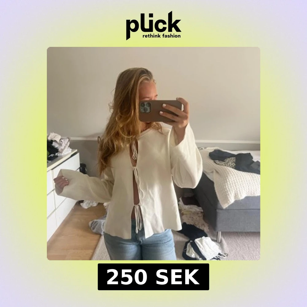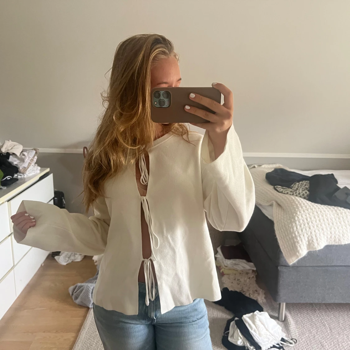 Säljer en vit blus med långa ärmar och tre knyt framtill från Gina, den har en liten tråd som synd där fram men inget man tänker på, va så när jag köpte den, typ oanvänd