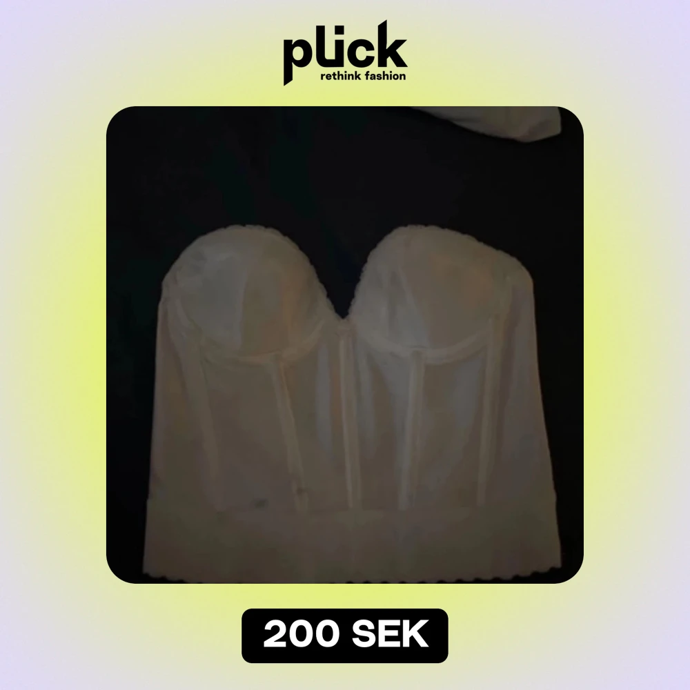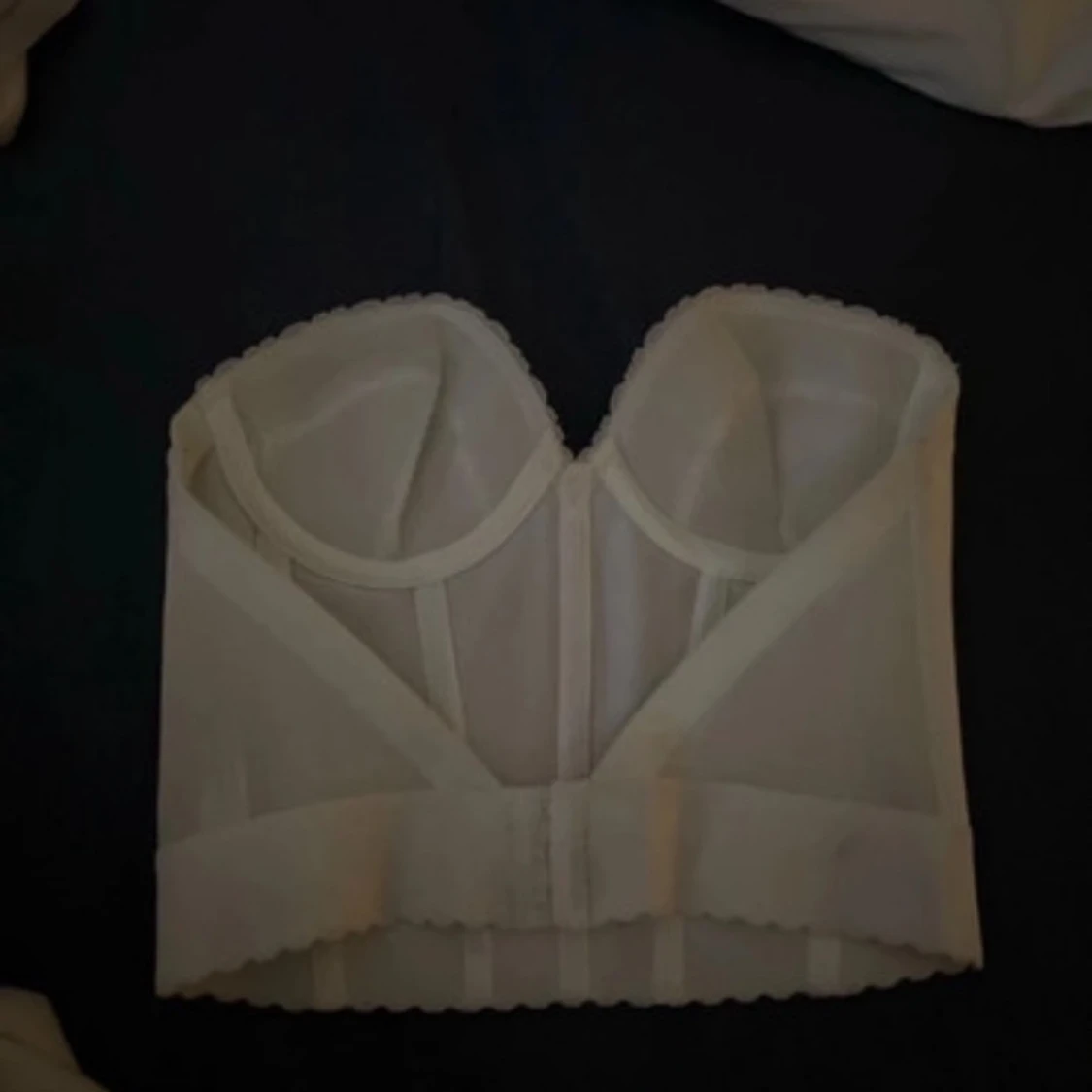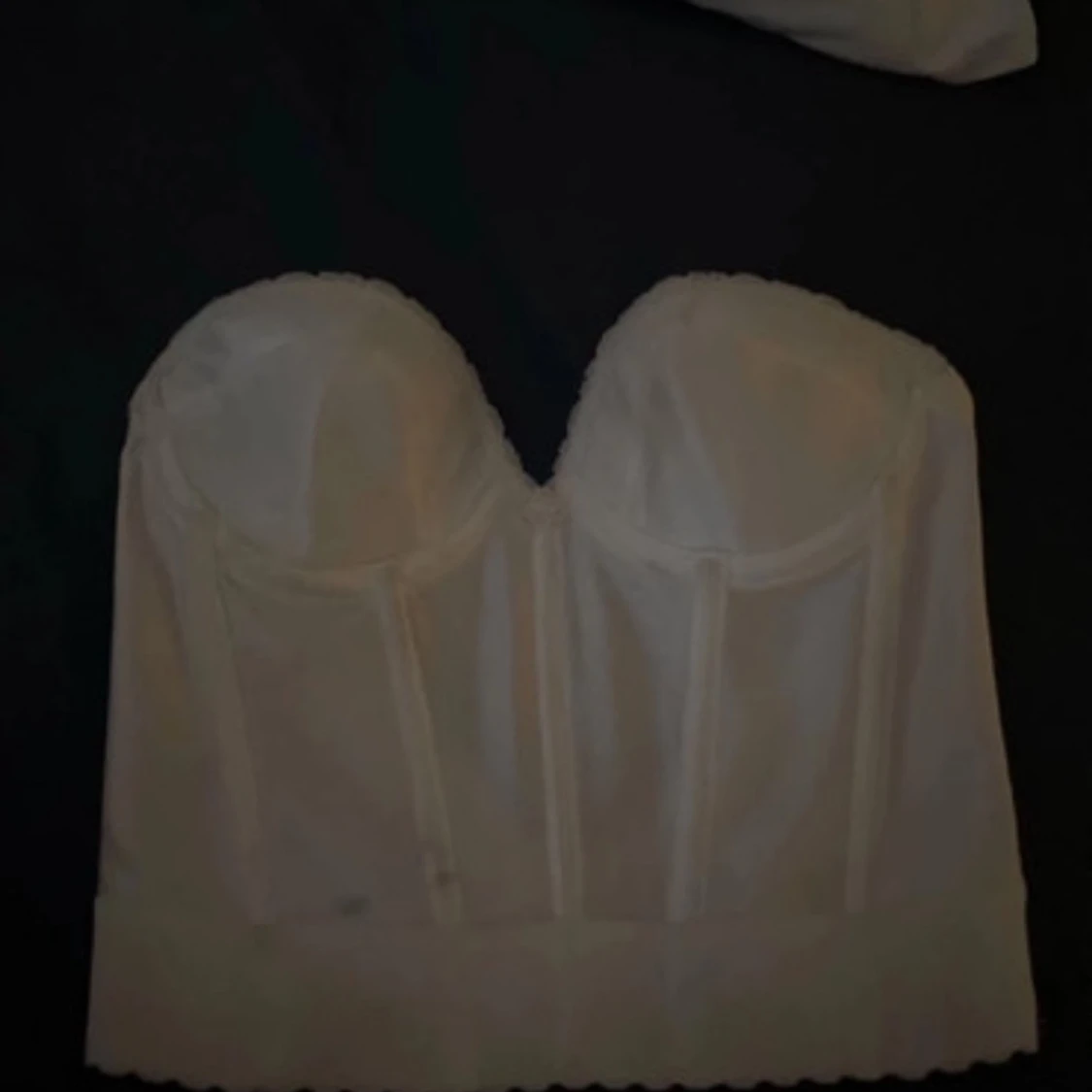 Snygg vit korsett i ett stilrent och klassiskt snitt. Den är axelbandslös och har en strukturerad design med synliga sömmar som ger en elegant look. Perfekt för att bära under en klänning eller som en statement piece till fest.