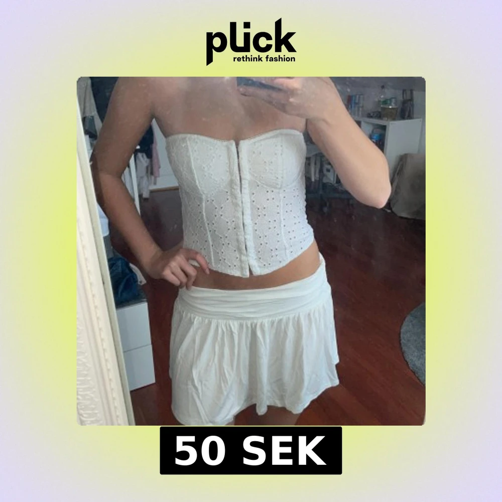 Säljer en stilren vit korsett med vackra spetsdetaljer och knäppning fram. Perfekt för att ge en elegant touch till din outfit. Passar bra till både kjol och byxor. Off shoulder, snygg till sommaren