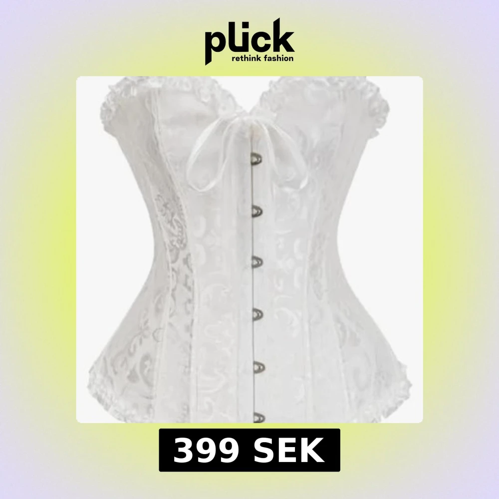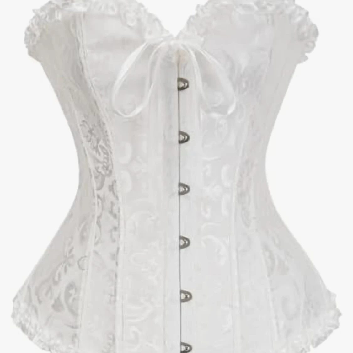 Supersnygg vit korsett med dekorativ rosett framtill och fina spetsdetaljer längs nederkanten. Korsetten har ett subtilt mönster och knäppning framtill, perfekt till halloween!