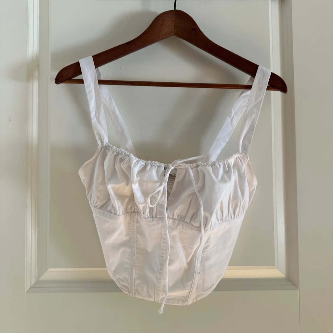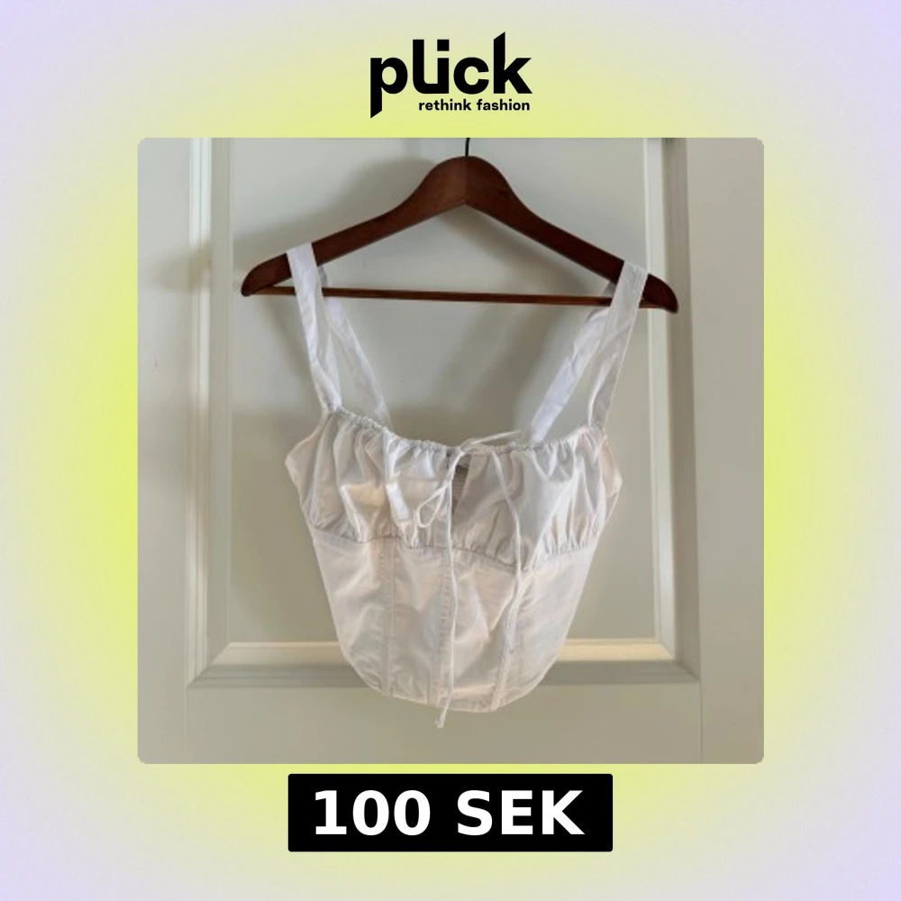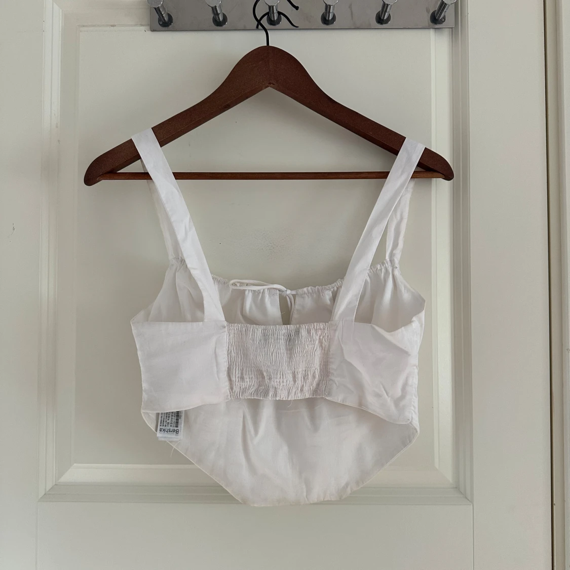 Säljer en vit korsett-topp från Bershka med breda axelband och snygg knytning framtill. 🤍
