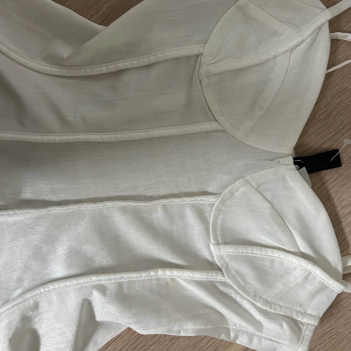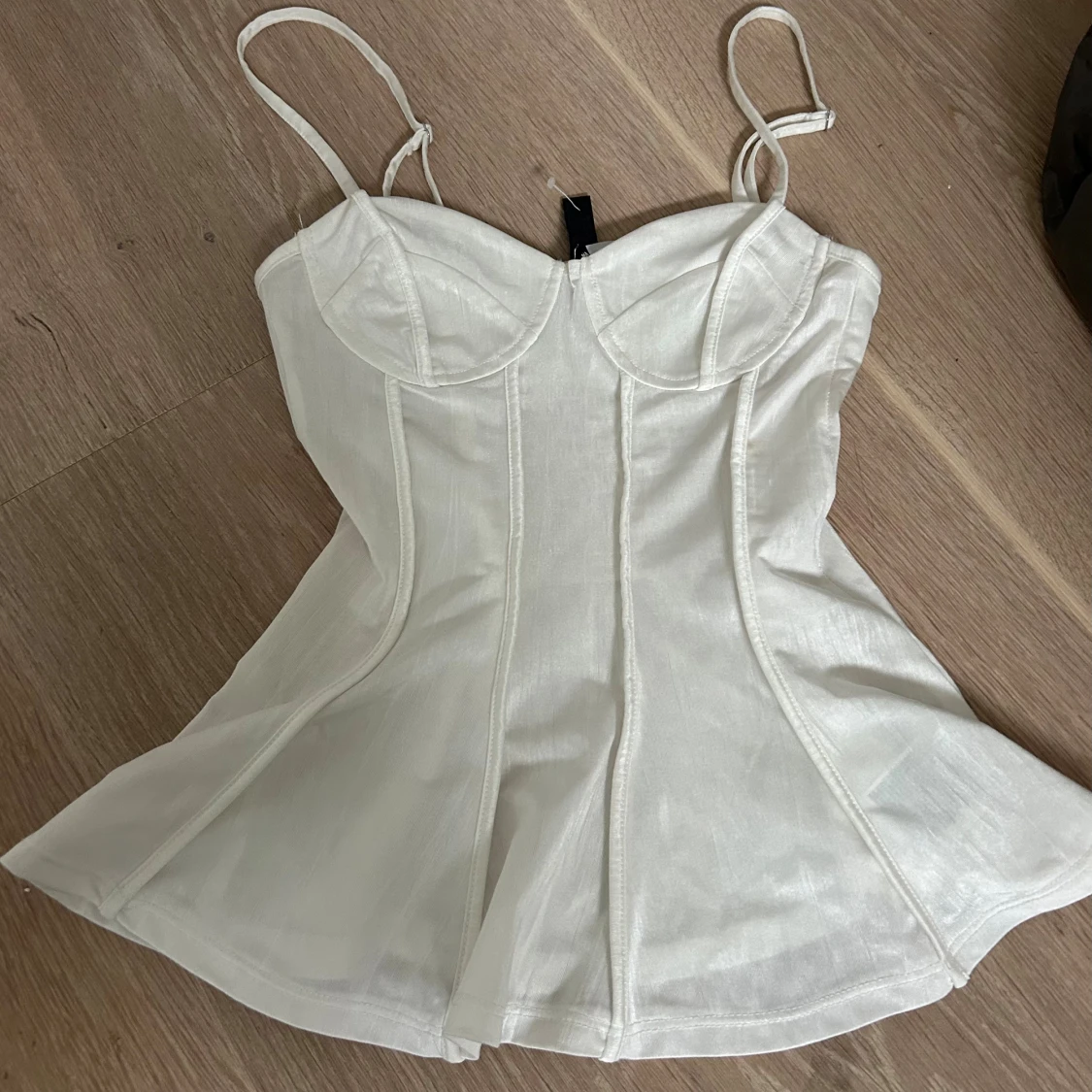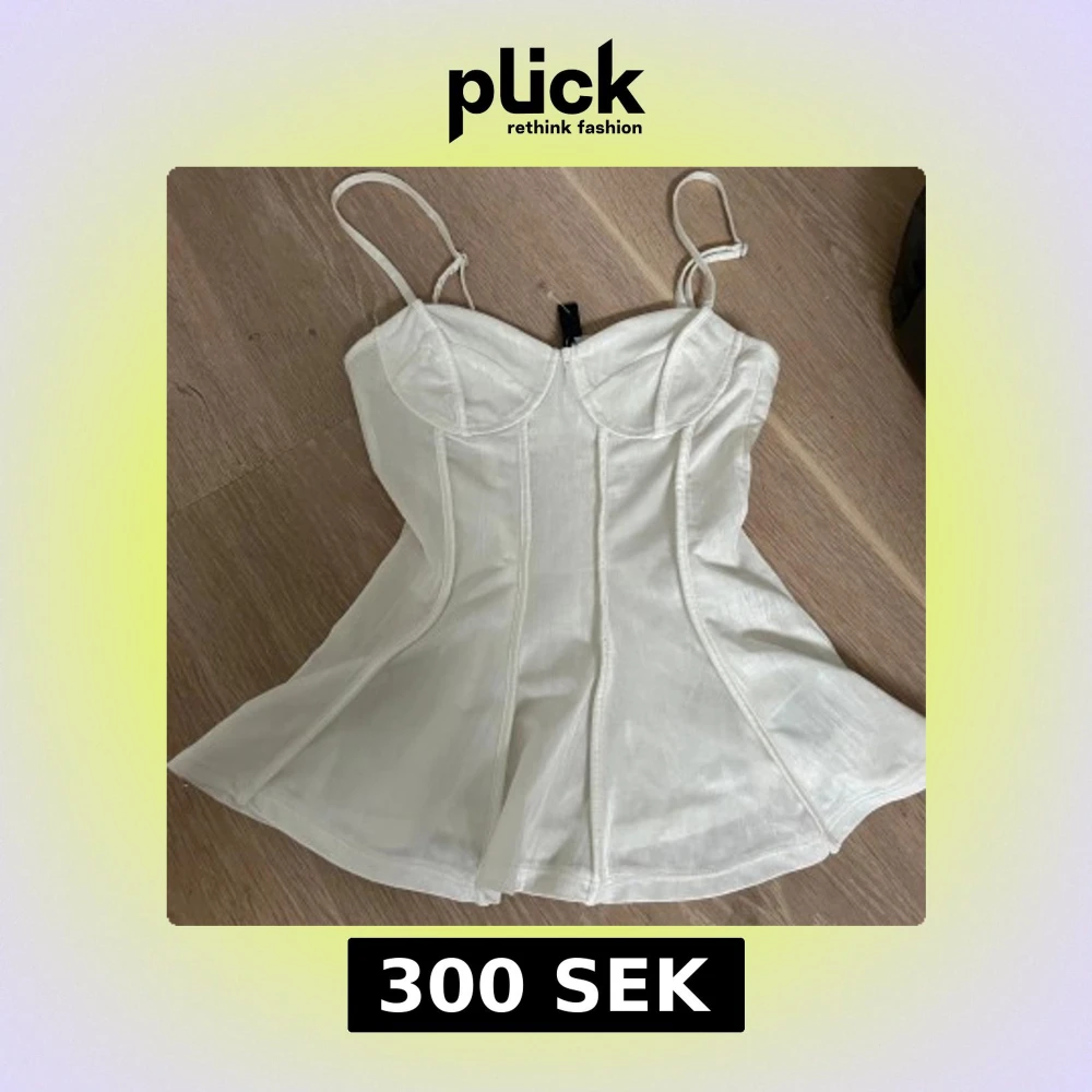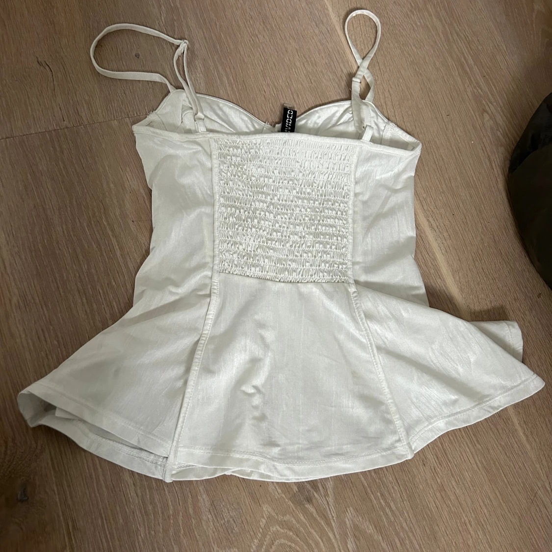 Supersnygg vit korsett-topp från HM med tunna axelband och markerade sömmar framtill. Toppen har lätt utsvängd nederdel och smockad rygg för extra komfort. Produceras inte längre! Passar strl xxs-s då materialet är stretchigt