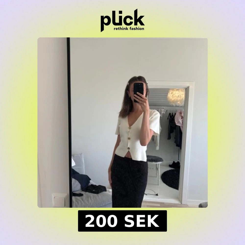 Säljer en stilren vit blus med korta ärmar och v-ringning. Toppen har snygga guldiga knappar framtill och är lätt croppad för en modern look. Perfekt att matcha med både kjol och jeans för en clean och fräsch stil.