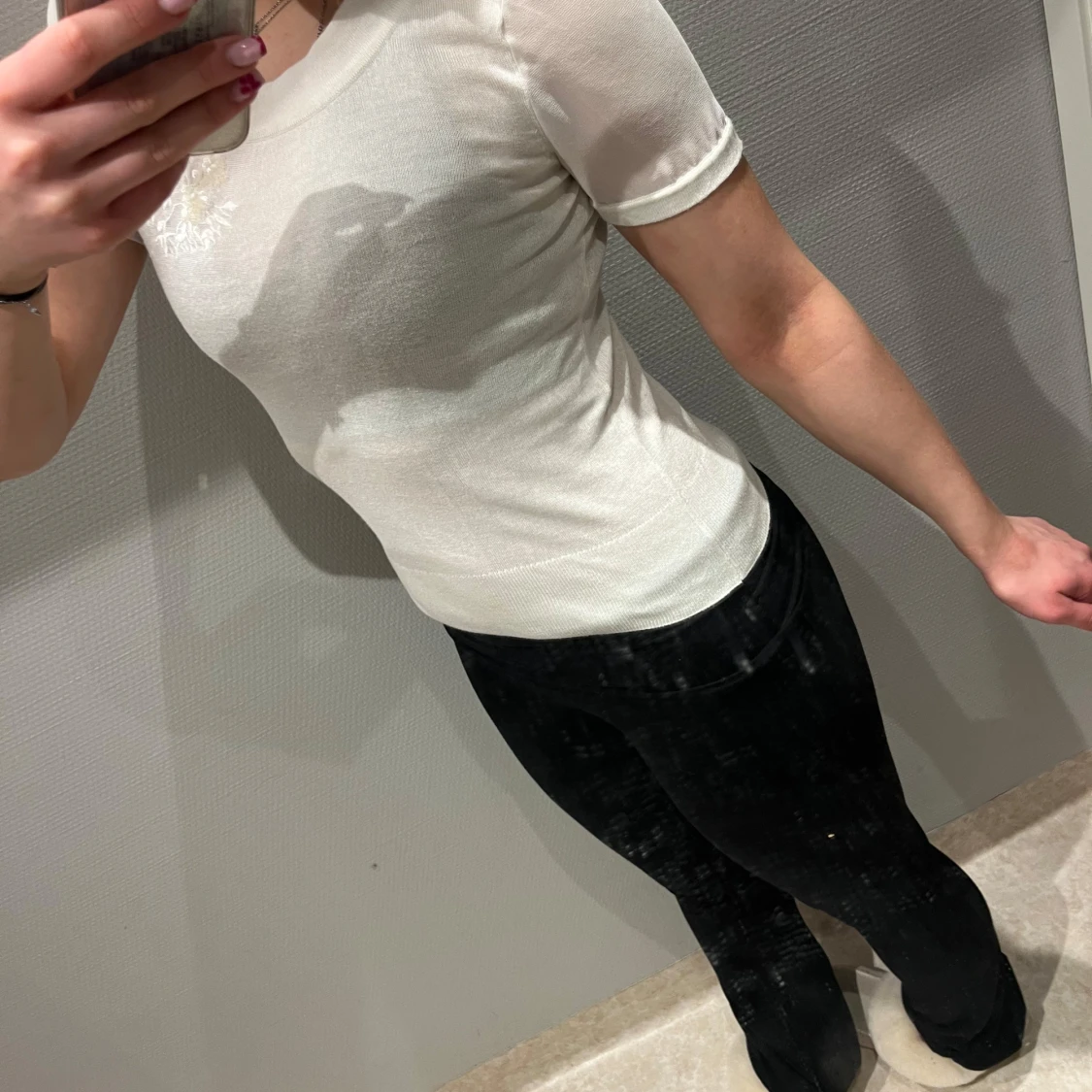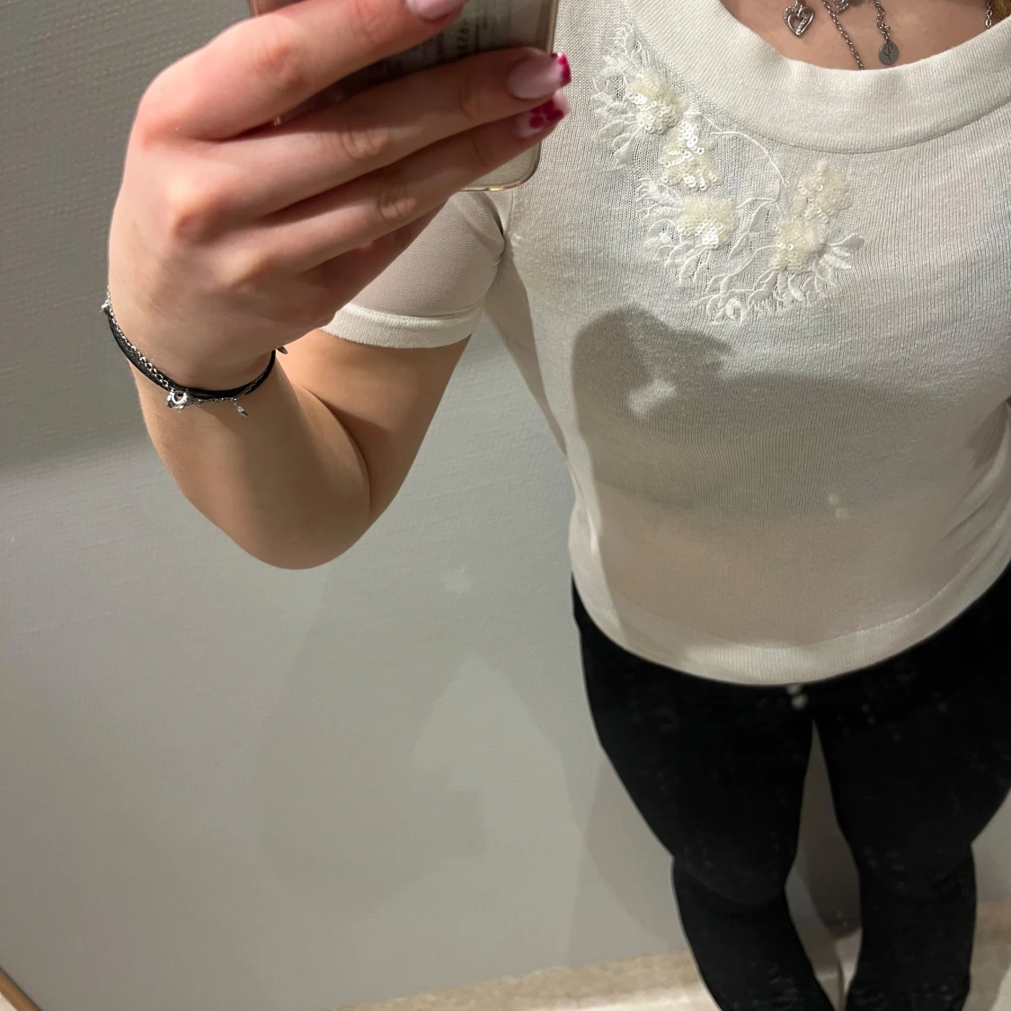 Säljer en stilren vit topp med korta ärmar och vackert broderi på bröstet. Perfekt för en elegant och enkel look. Passar bra till både jeans och kjol.
