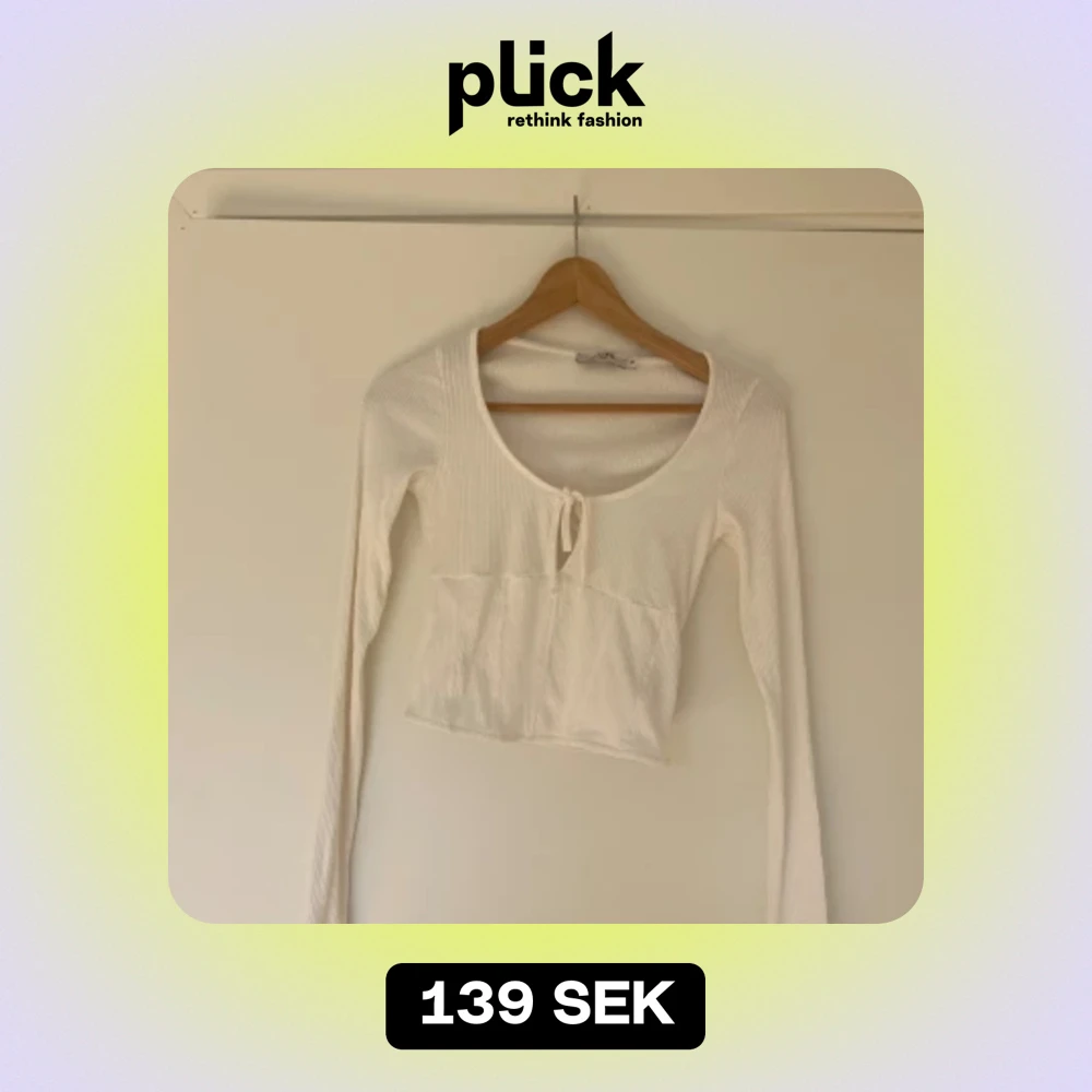 Uringad vit ribbad långärmad med detalj på framsidan. Man kan spänna åt banden framtill för att göra ”hålet” mindre. Aldrig använd, nyskick💗