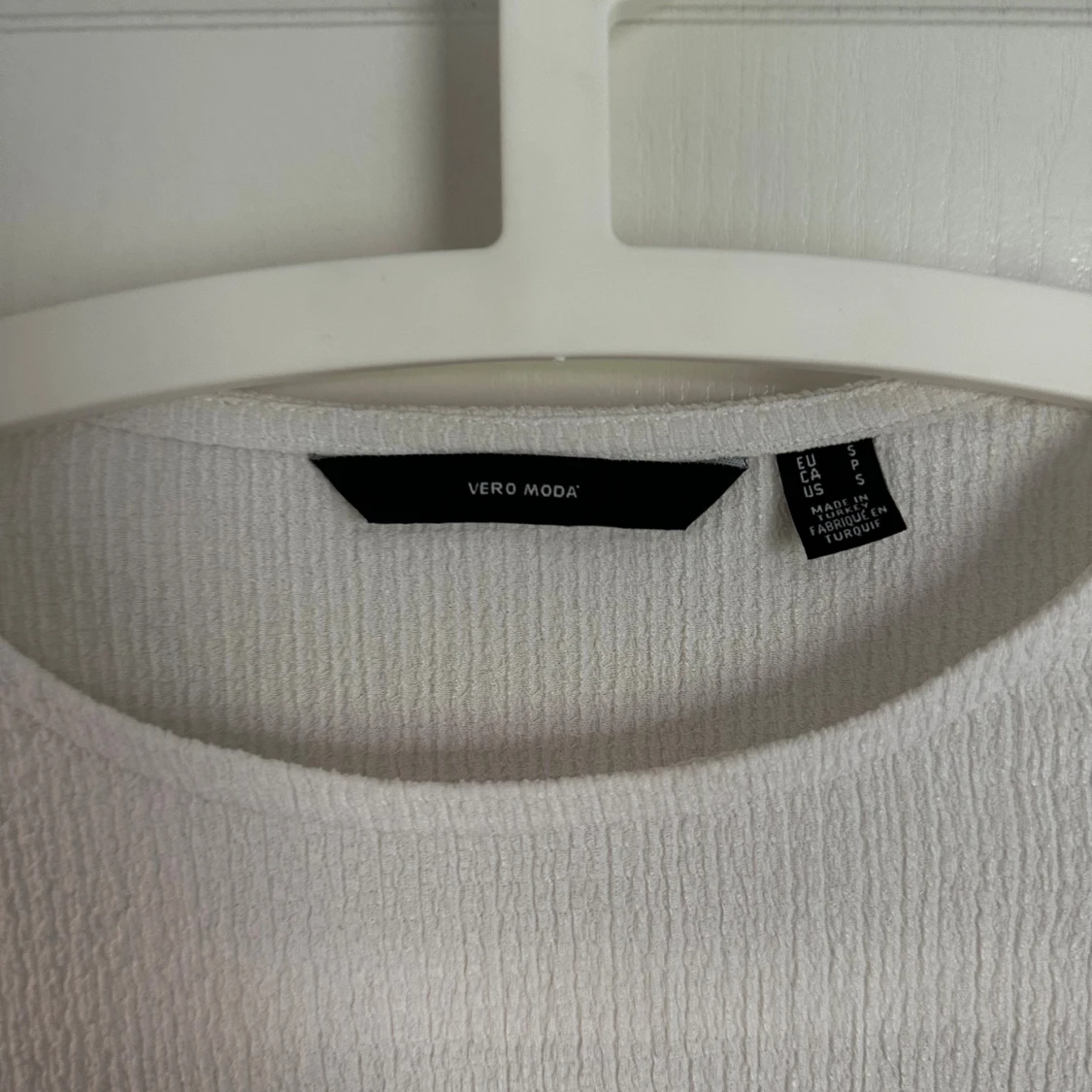Säljer en stilren vit blus från Vero Moda i storlek S. Blusen har ett strukturerat tyg med lätt rynkade axlar och långa ärmar. Rund halsringning och rak passform gör den enkel att matcha med olika outfits. Perfekt för dig som gillar minimalistisk stil.