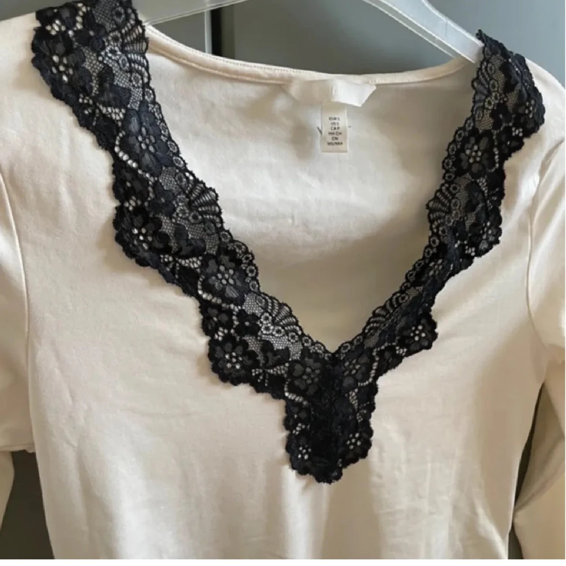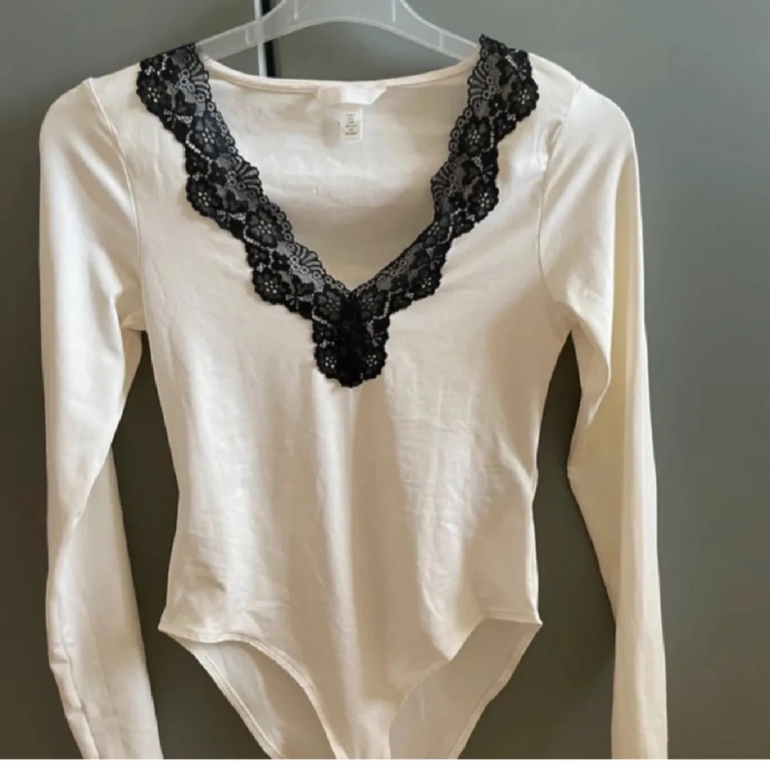 Säljer en vit body från H&M med långa ärmar och v-ringad spetsdetalj i svart. Perfekt vid alla tillfällen. Använd fåtal gånger!🥰❣️