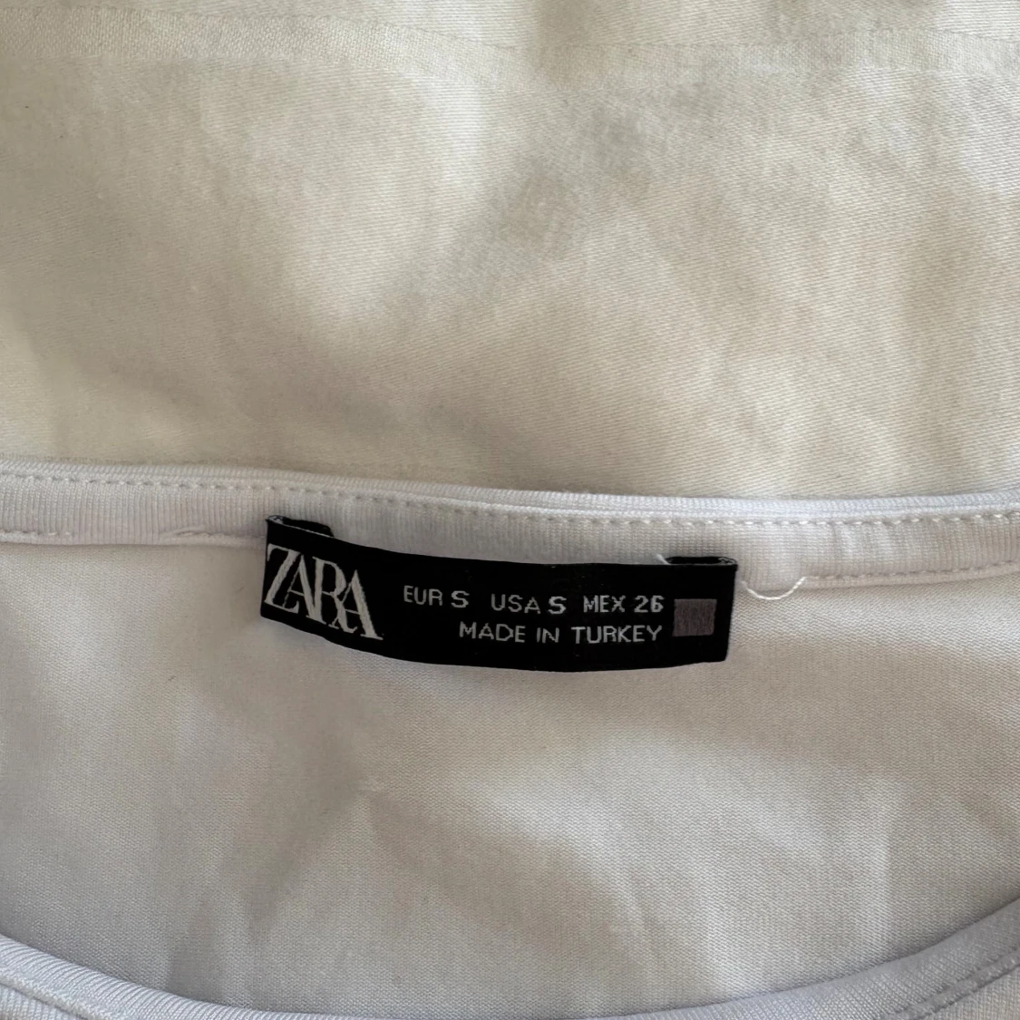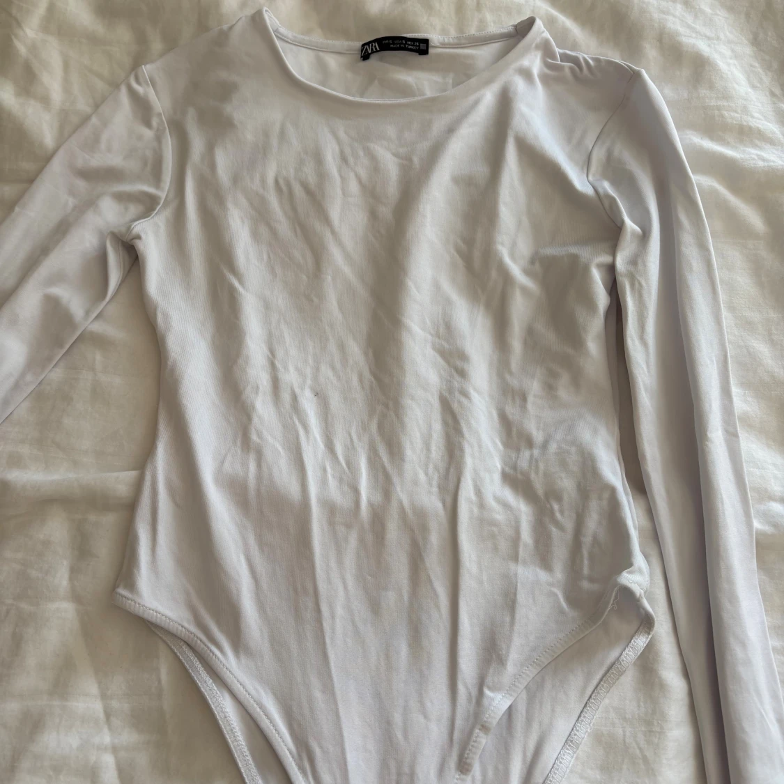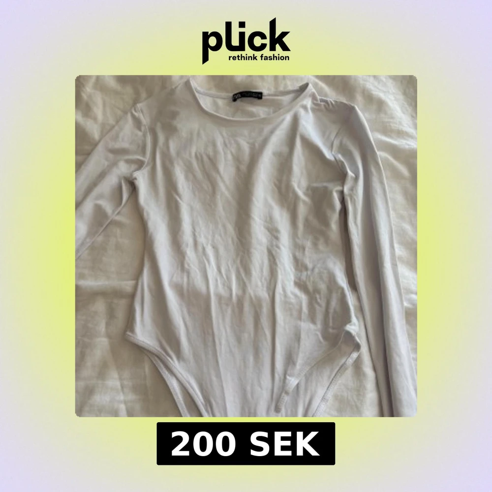 Säljer en stilren vit bodysuit från Zara i storlek S. Modellen har rund halsringning och långa ärmar, perfekt för att skapa en clean och enkel look. Materialet är mjukt och stretchigt, vilket gör den bekväm att bära hela dagen.
