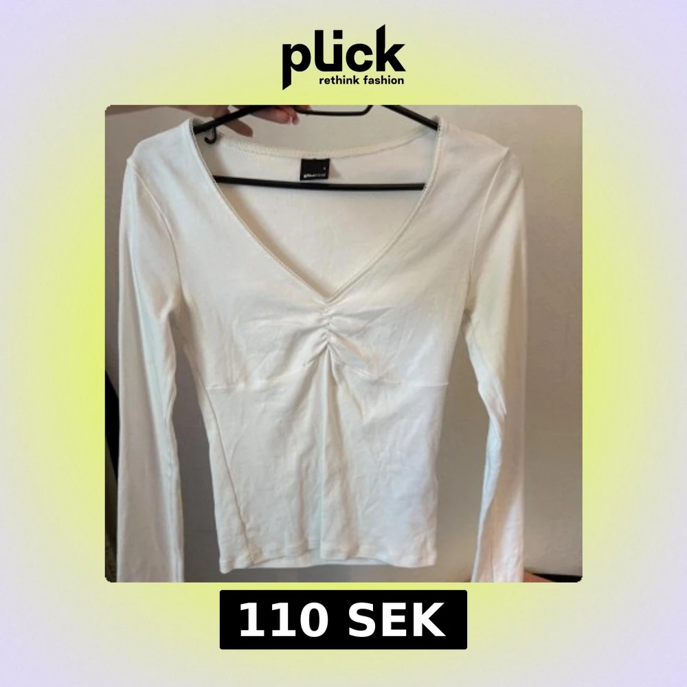 Snygg vit långärmad topp från Gina Tricot med v-ringning och rynkdetalj framtill. Toppen är i mjuk bomull och har en figurnära passform som passar perfekt till jeans eller kjol.