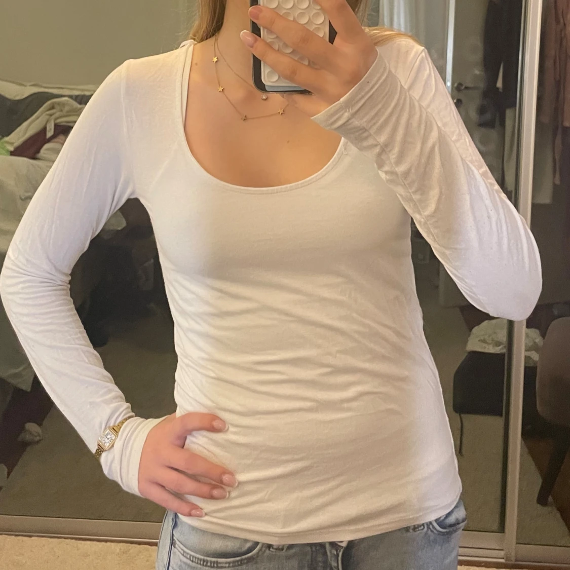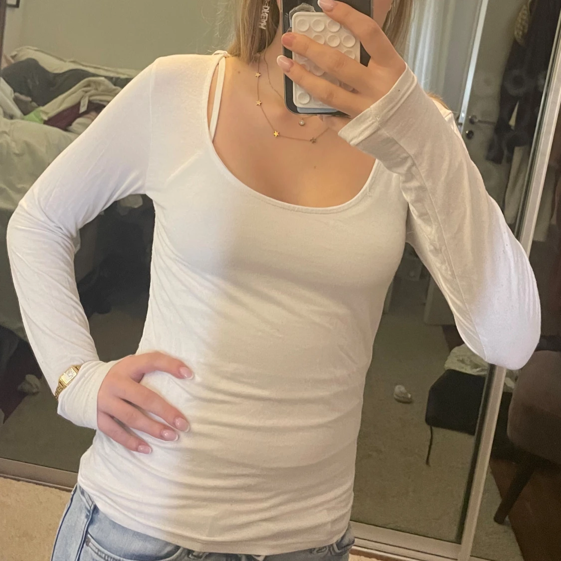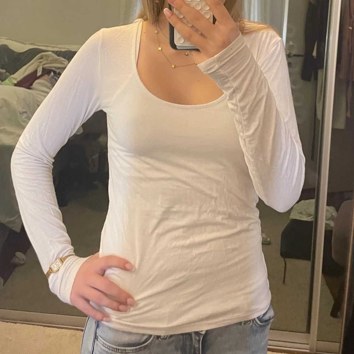 Söt vit långärmad tröja. Perfekt som både ett basplagg men även fin tröja💕💐 storlek xs men passar som S