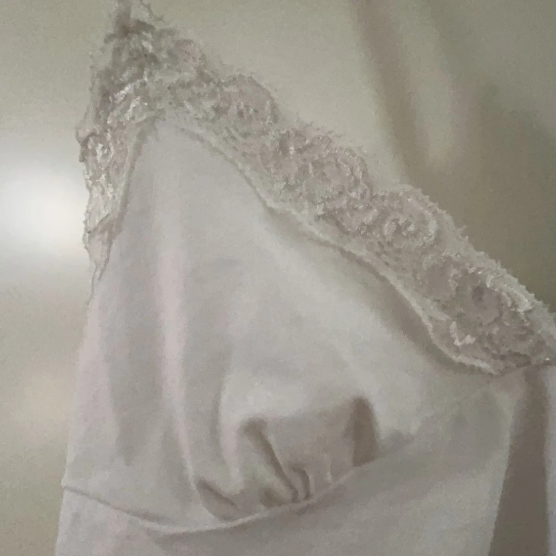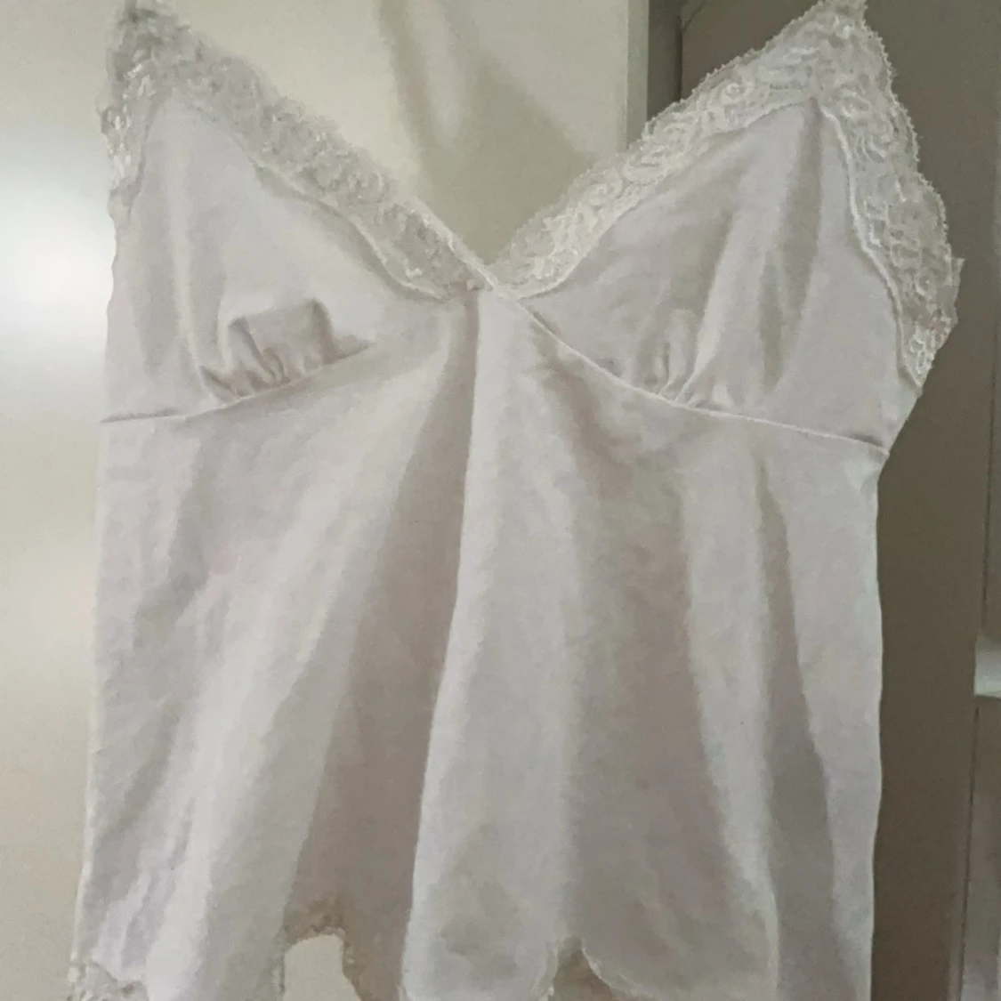 Säljer en söt vit linne med spetsdetaljer längs kanterna. Toppen har en v-ringad design. Den är tillverkad i ett mjukt och bekvämt material.Meddela mig om det är några minsta funderingar💕
