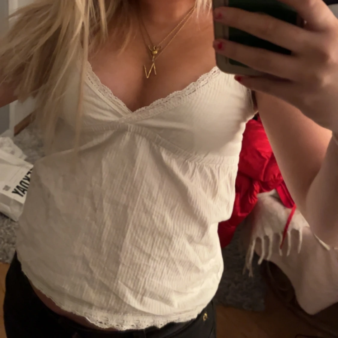 Säljer ett sött vitt linne med spetsdetaljer och v-ringning. Perfekt för sommardagar eller som ett lager under en tröja. Linnet har en avslappnad passform och är tillverkat i ett lätt material.