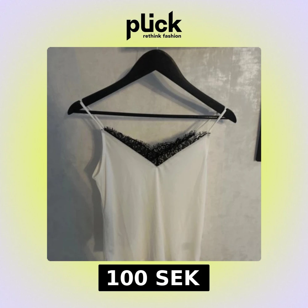 Säljer ett stilrent vitt linne med svarta spetsdetaljer vid halsringningen. Linnet har smala axelband och en elegant v-ringning. Perfekt för en chic och enkel look.
