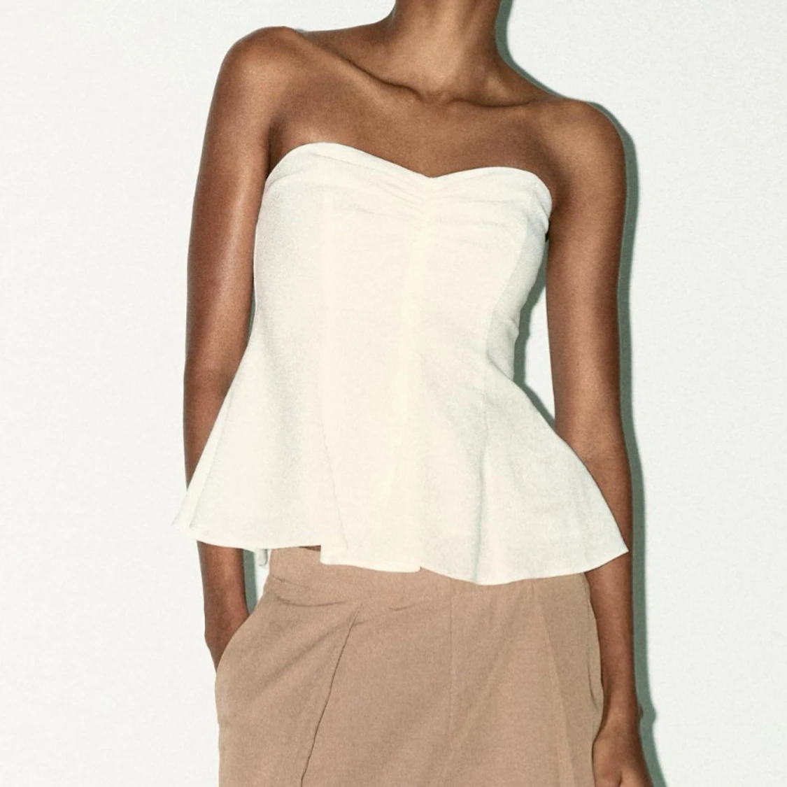 Säljer en vit tubtopp i linne från Zara med lätt volang nertill. Toppen är axelbandslös och har en snygg rynkning framtill. Den har även en dragkedja på sidan. Säljer för att den är för liten för mig, den är helt oanvänd med prislappen kvar och slut på hemsidan. 💕