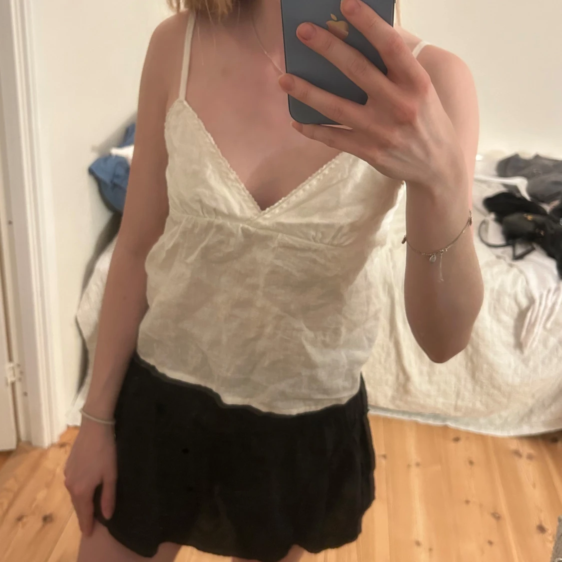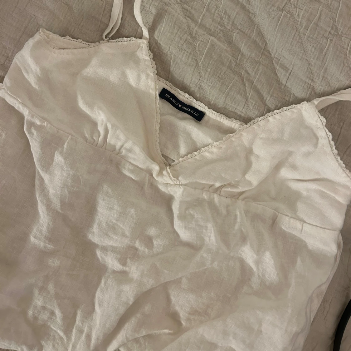 Vitt linne i linnetyg från Brandy Melville, oanvänd, blir finare när man stryker. 60kr Knytning i ryggen