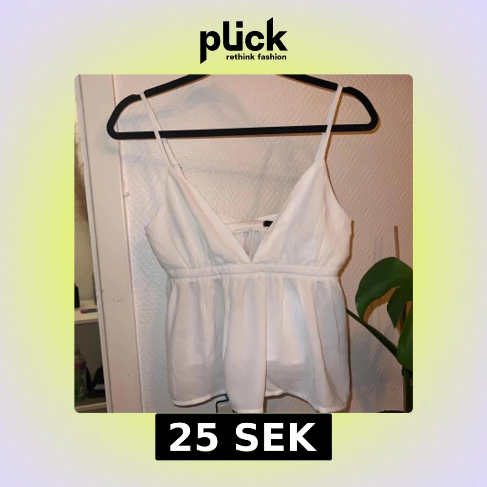 Säljer en vit linnetopp med v-ringad hals och tunna justerbara axelband. Toppen är från bik bok och är i storlek xs