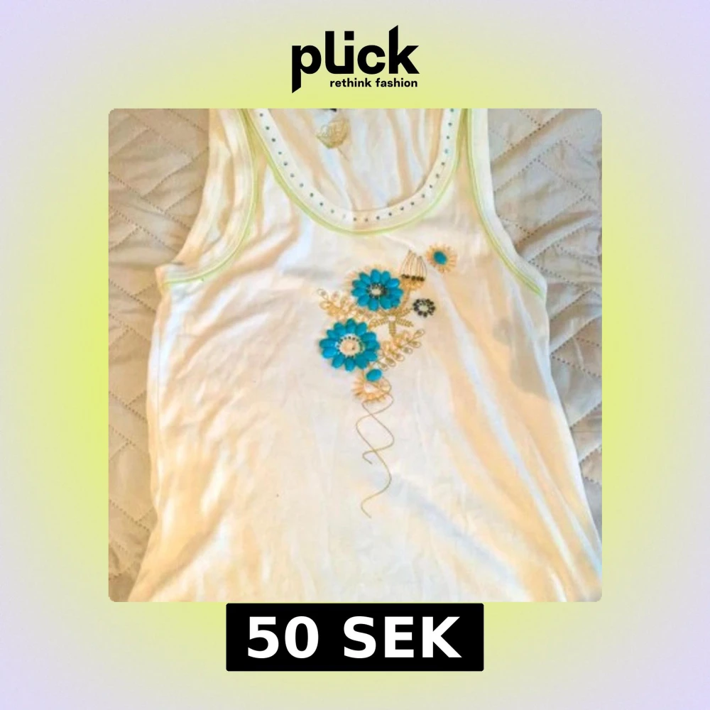 Supersöt vit linnetopp från CN Collection med unika blå blommor och guldbroderi framtill. Toppen har ärmlös design och små blå stenar runt ringningen för extra detalj. Perfekt för dig som gillar färgglada och kreativa plagg inför sommaren 😛