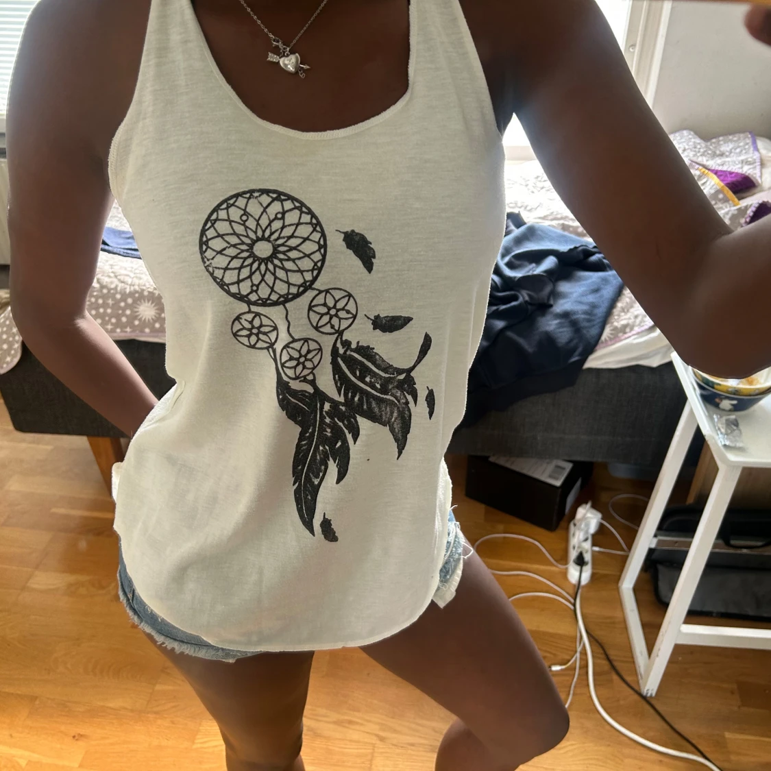Snygg vit linnetopp med svart drömfångarprint framtill.