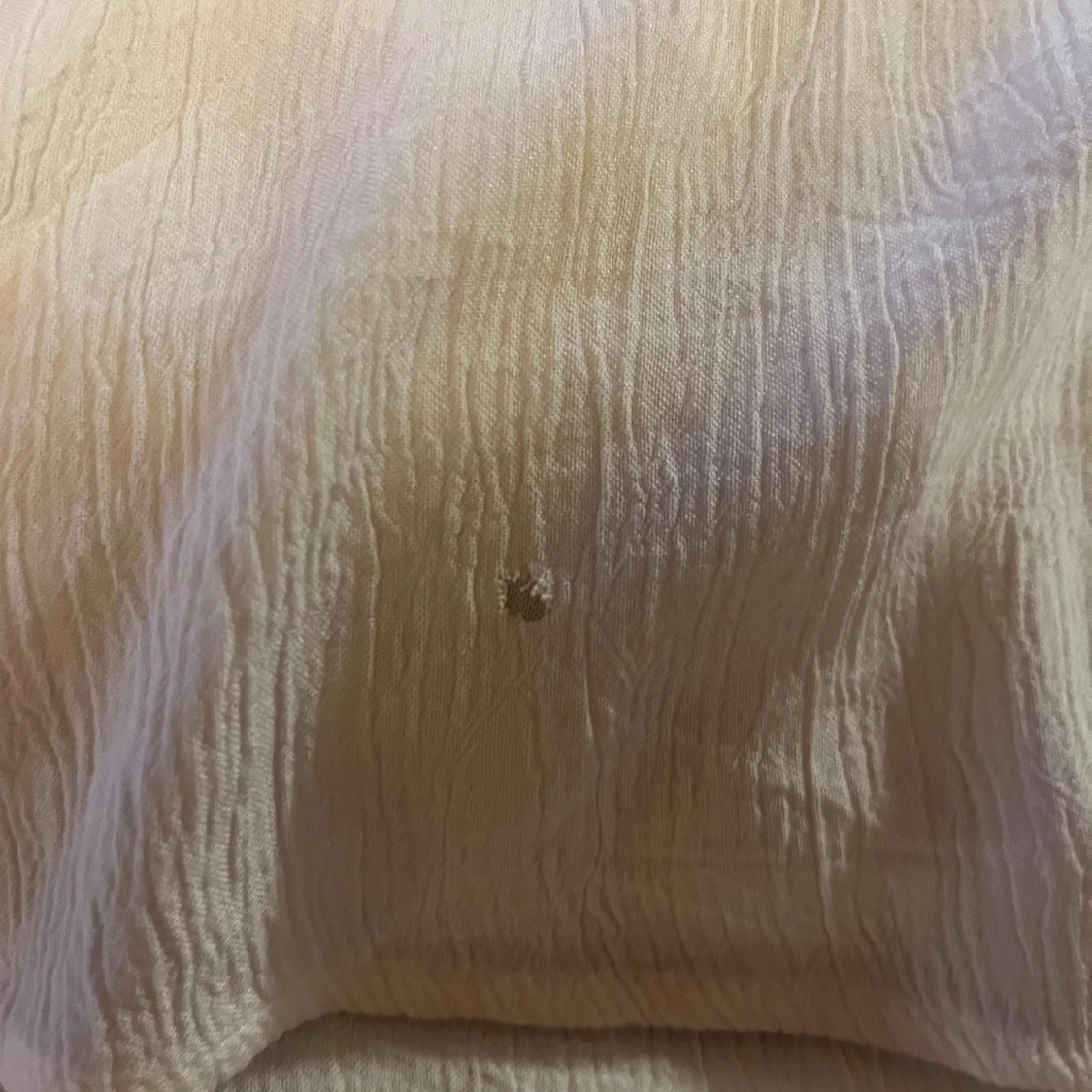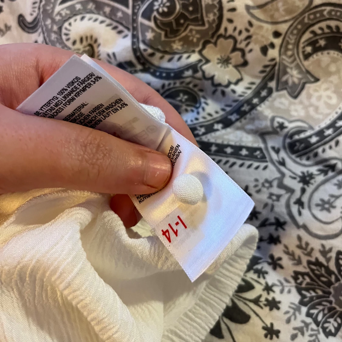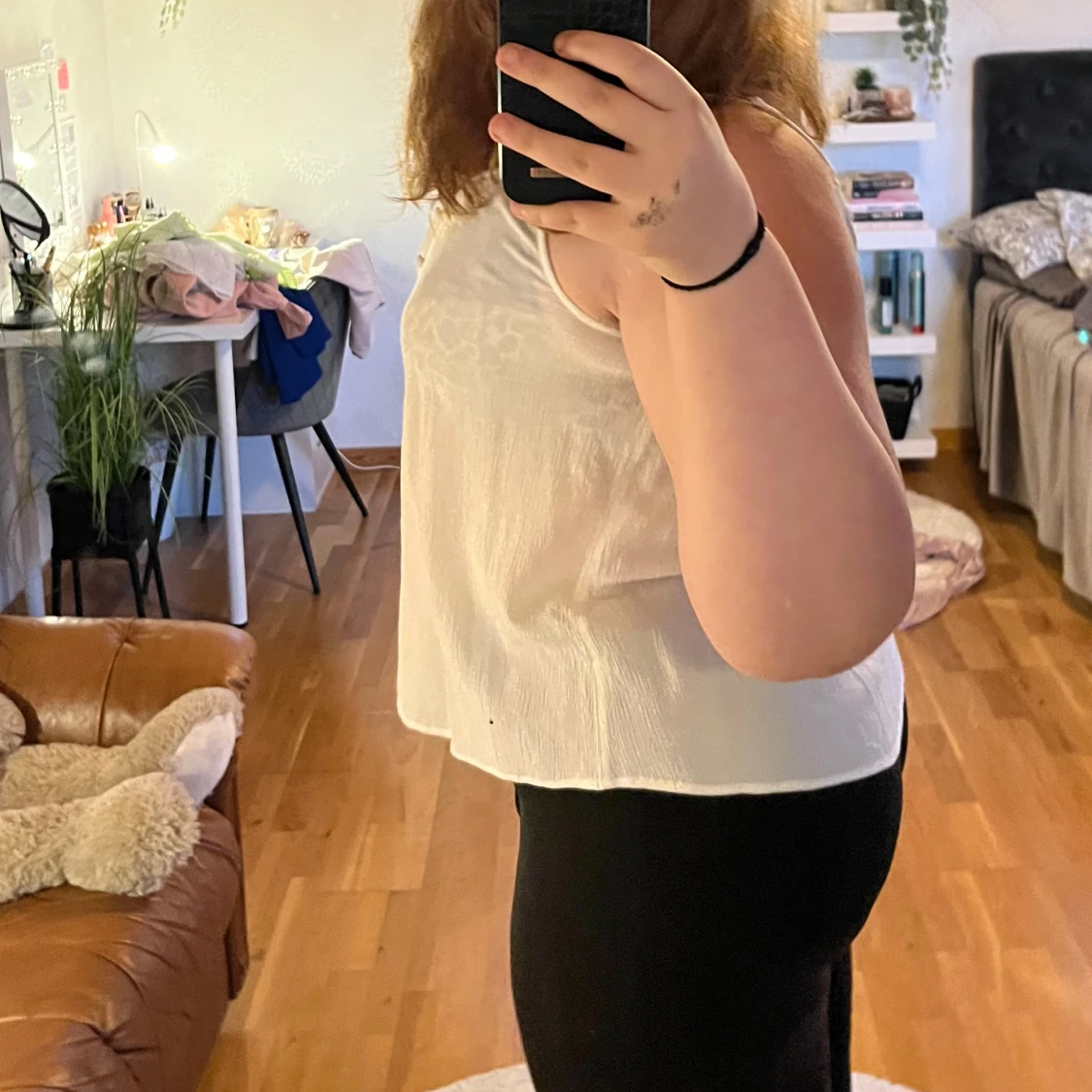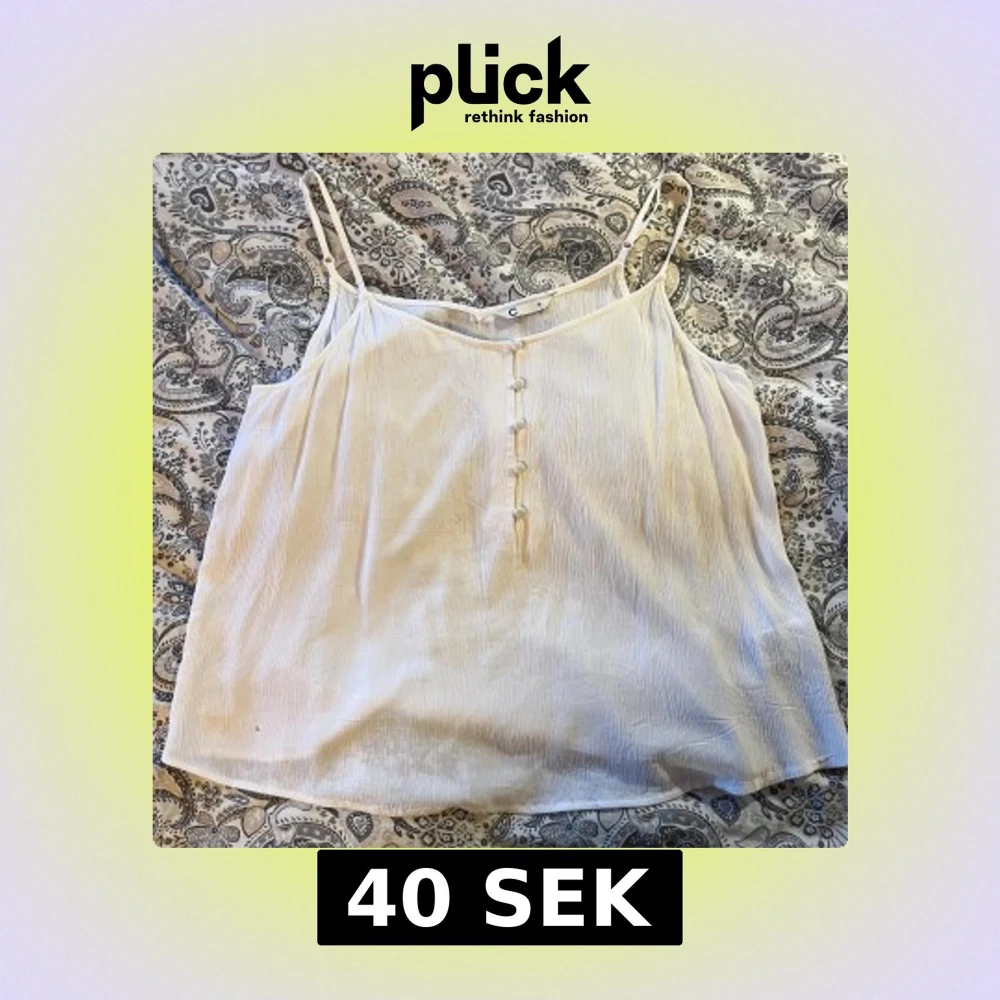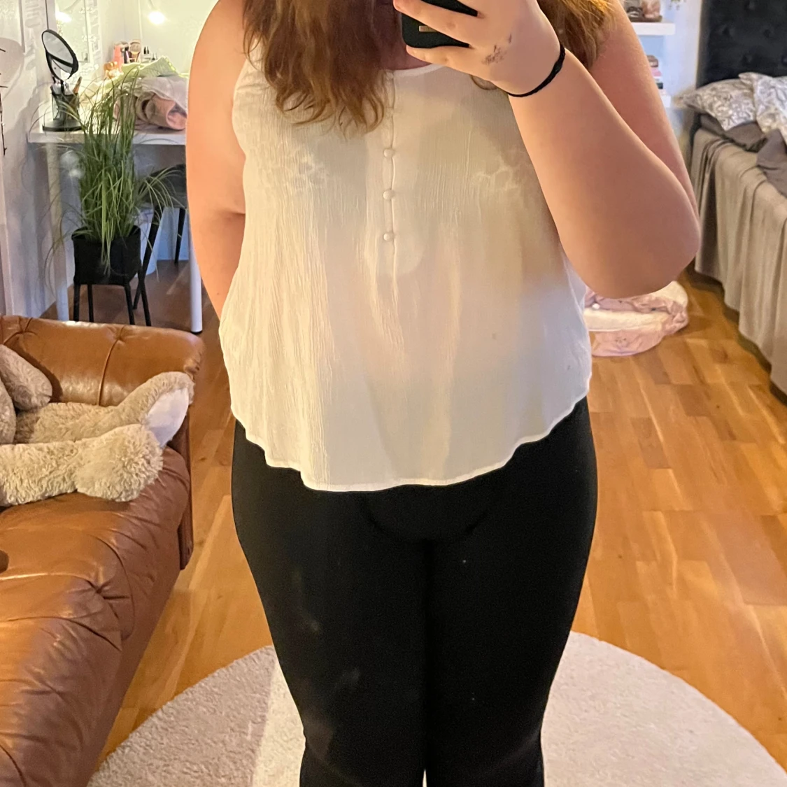 Säljer en luftig vit linnetopp med smala axelband och knappar framtill. Toppen har en lätt skrynklig struktur. Perfekt för varma dagar och enkel att matcha med olika outfits.Aldrig använd, men har dock ett väldigt litet hål i nederdelen!Kommer med en extra knapp.