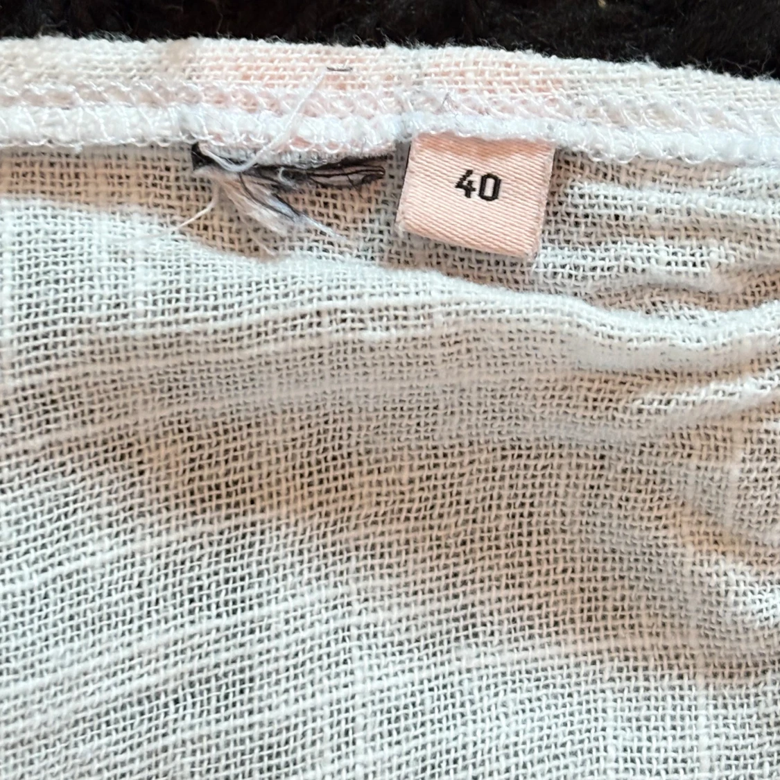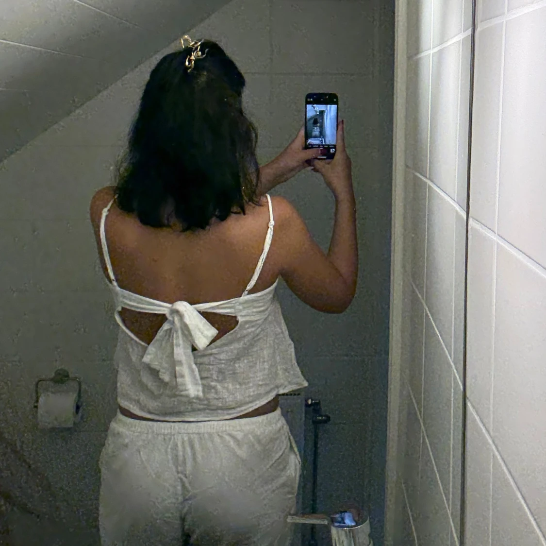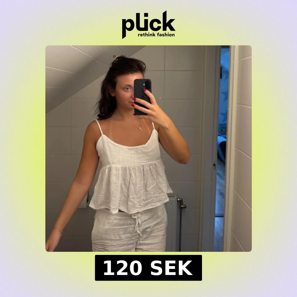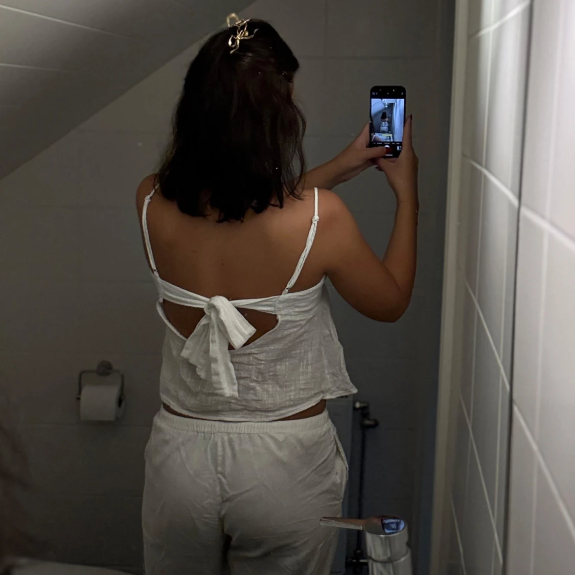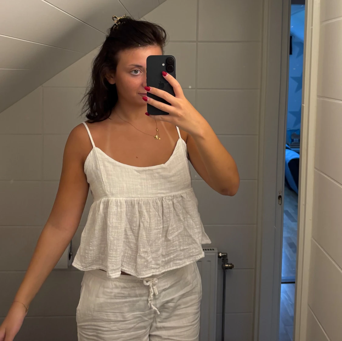 Säljer en superfin vit linnetopp från Nelly som man knyter i ryggen. Toppen har tunna justerbara axelband och volang nertill.
