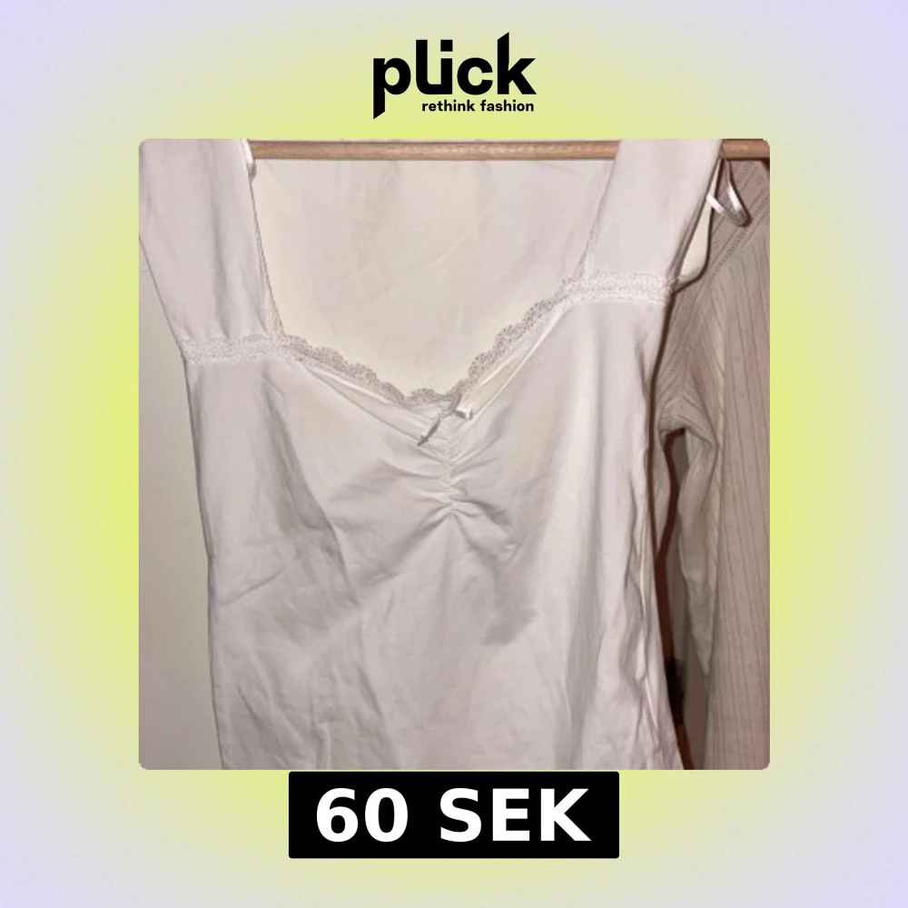 Supersöt vit linnetopp från 157 med v-ringning, spetsdetaljer längs ringningen och en liten rosett framtill. Toppen har rynk vid bysten och breda axelband. Perfekt att styla med jeans eller kjol för en fräsch look.