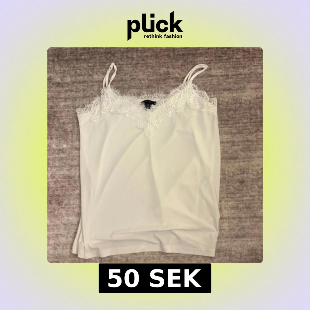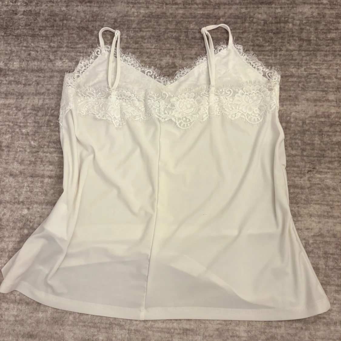 Säljer en vit linnetopp med tunna axelband och vacker spets längs urringningen. Toppen har en mjuk och följsam känsla, perfekt för lager-på-lager eller sommarens varma dagar.