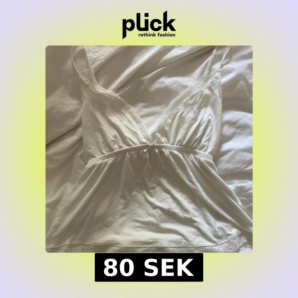 Supersöt vit linnetopp med tunna axelband och v-ringning. Toppen har fina spetsdetaljer längs urringningen och nederkanten samt en liten rosett framtill. Perfekt för en romantisk look eller som layering-piece.