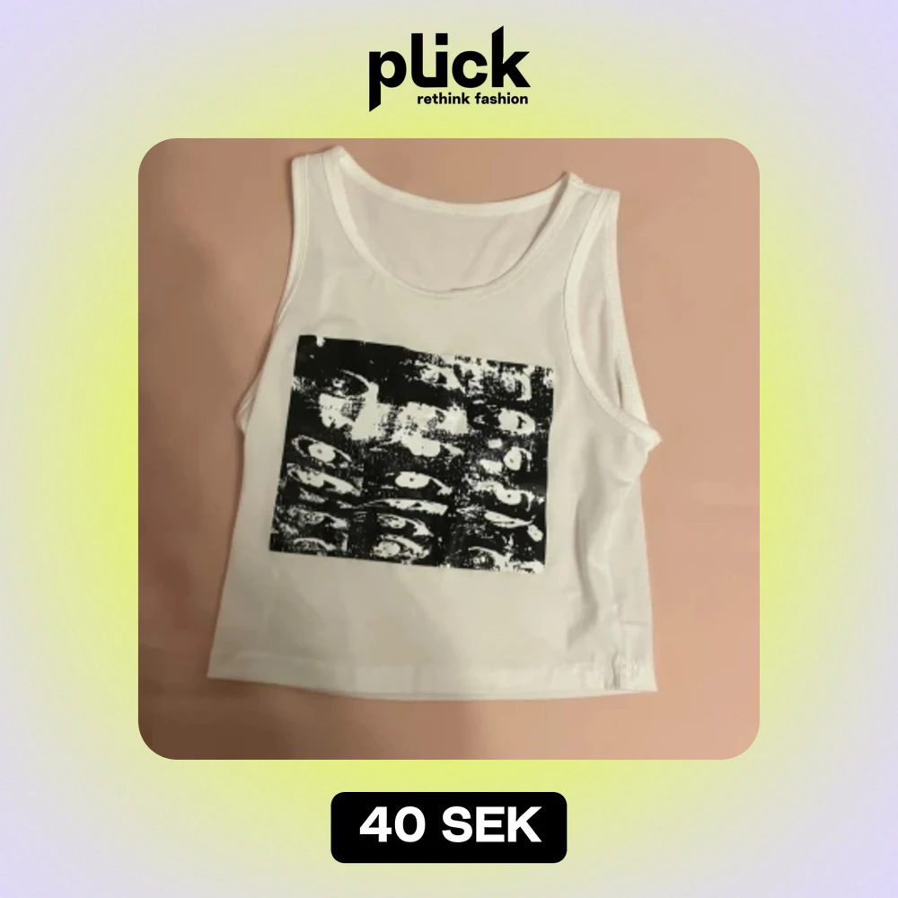 En vit linnetopp med ett svart tryck av ögon på framsidan. Toppen är ärmlös och har en rund halsringning. Skriv gärna om ni har frågor 💕