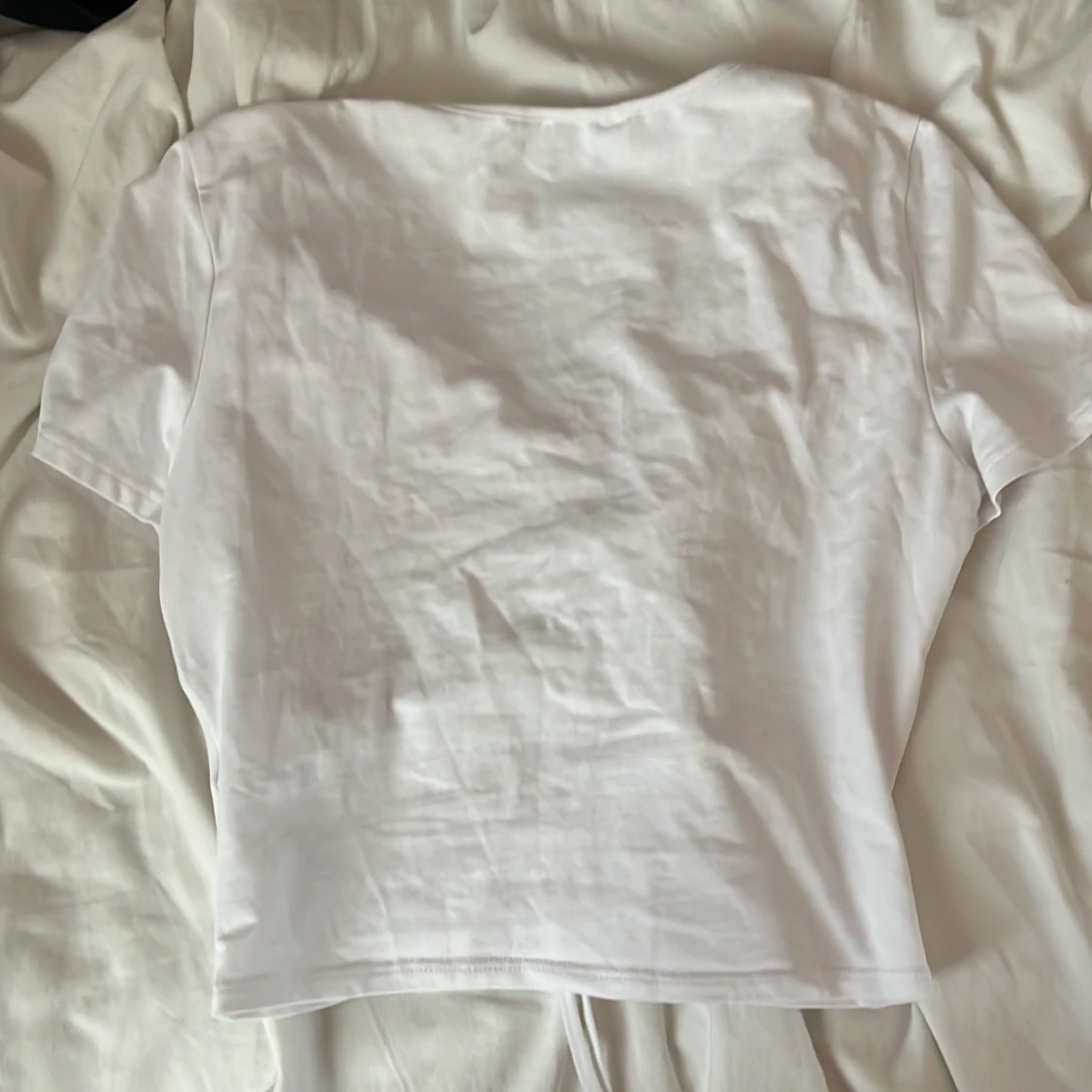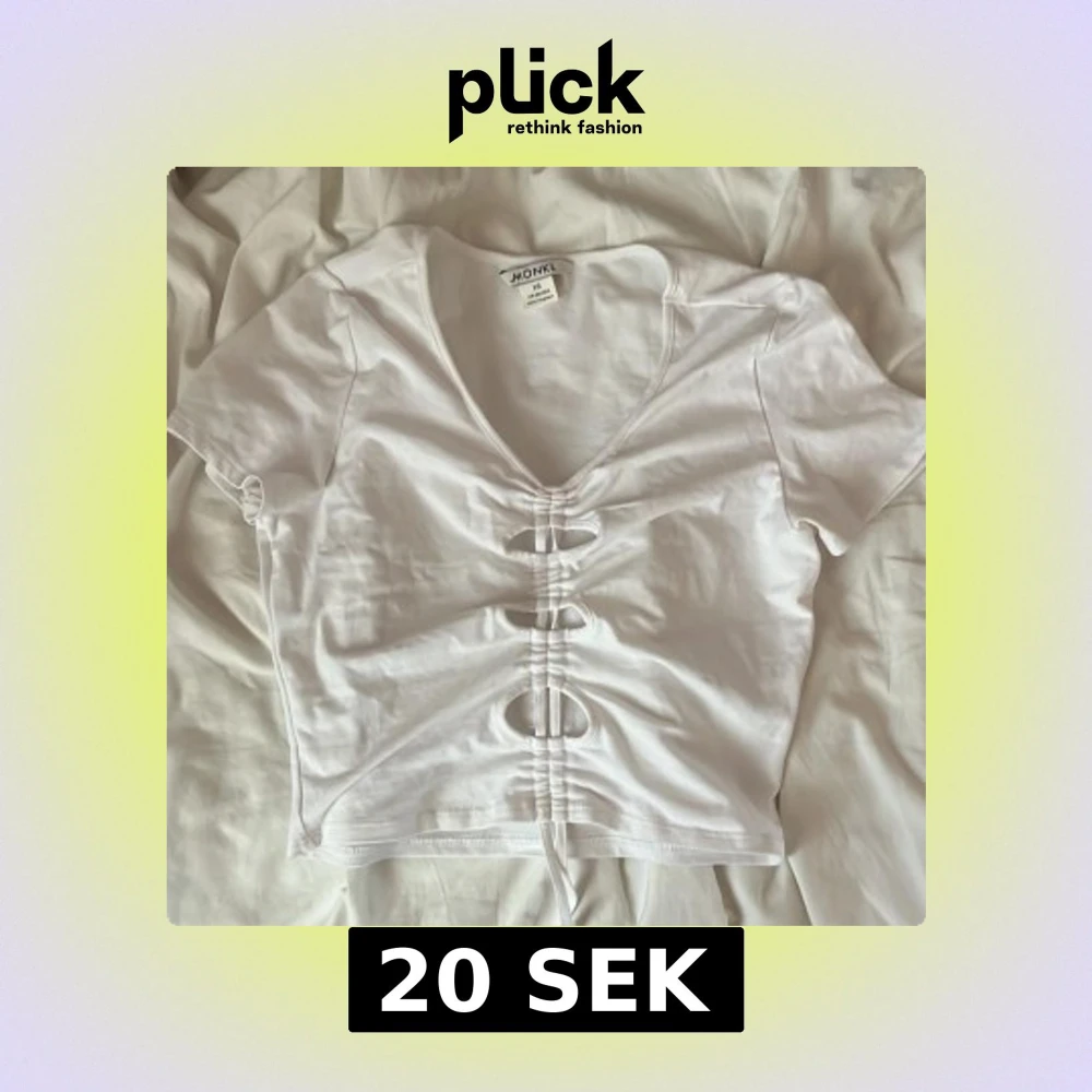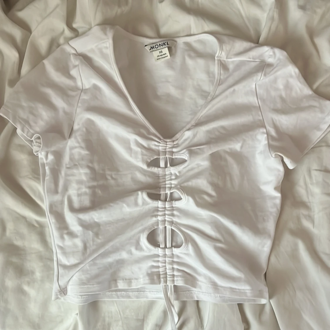 Säljer en vit croppad topp från Monki i bomull med korta ärmar och v-ringning. Typ aldrig använd, så väldigt bra skick!❤️