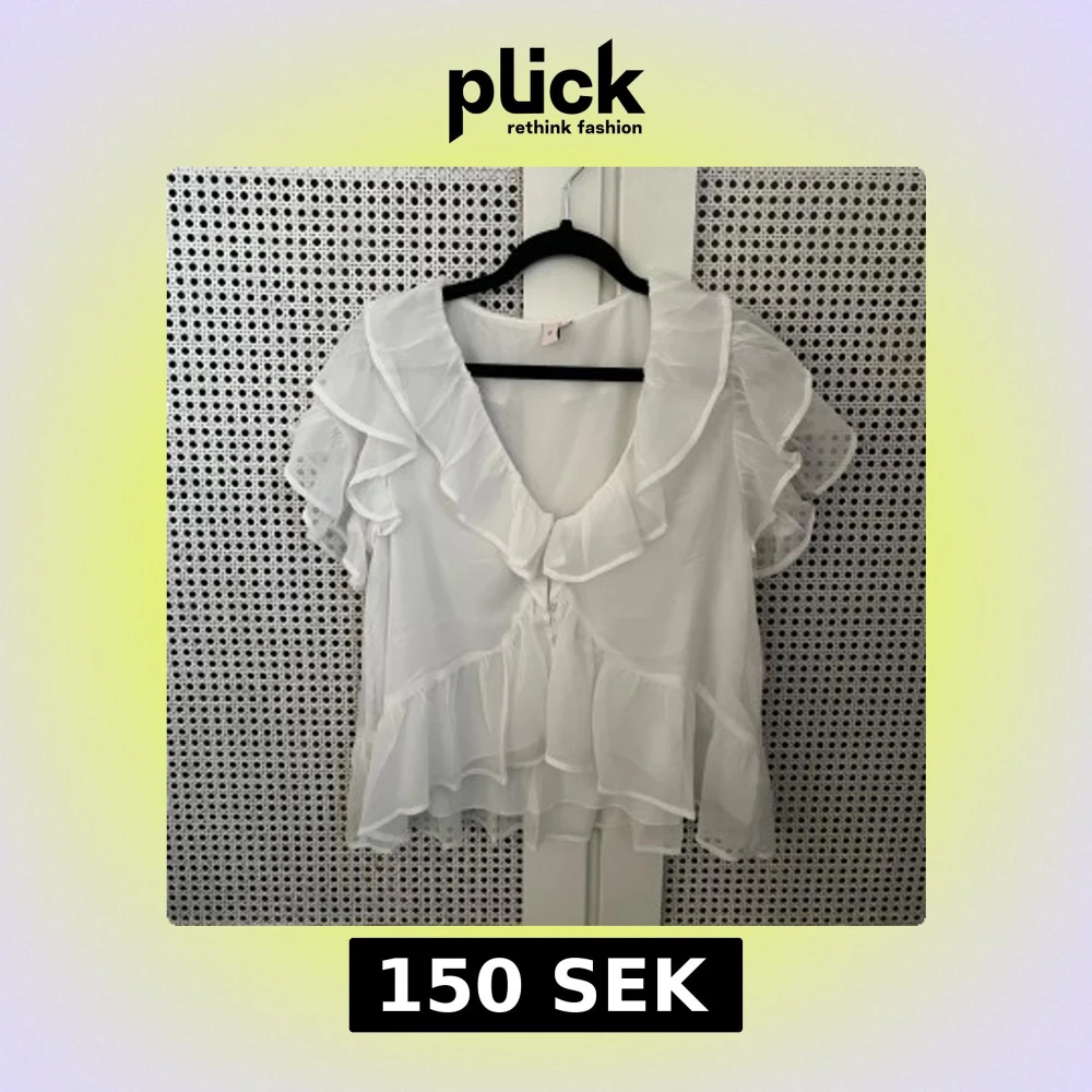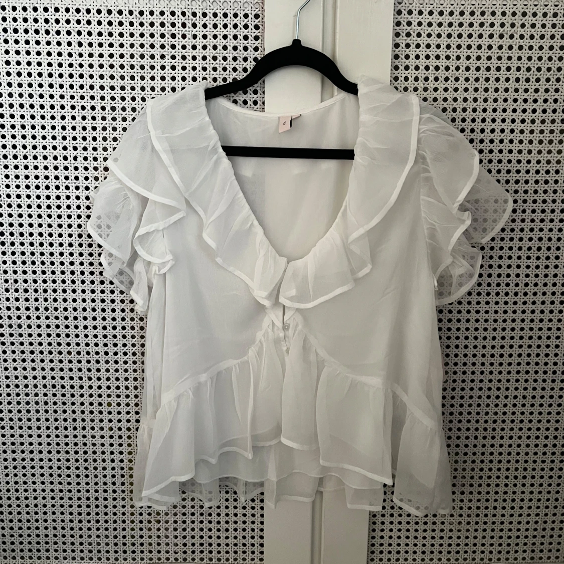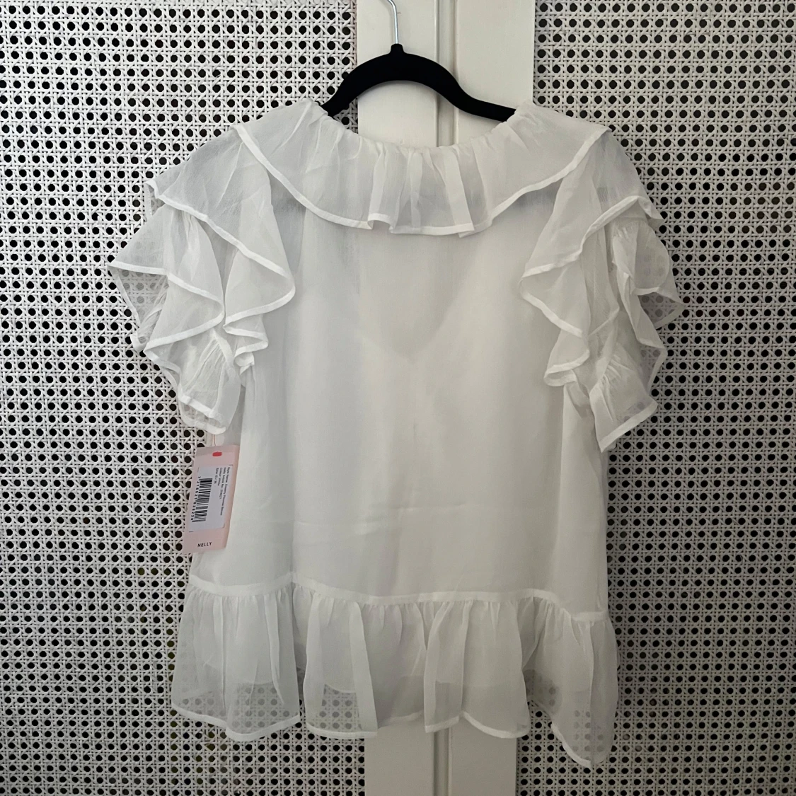 Aldrig använd. Strl 36 Supersöt vit blus från Nelly med transparenta volanger längs halsringning, ärmar och nederkant. Blusen har v-ringad front och korta ärmar med extra volym. Perfekt för dig som gillar romantisk och feminin stil.