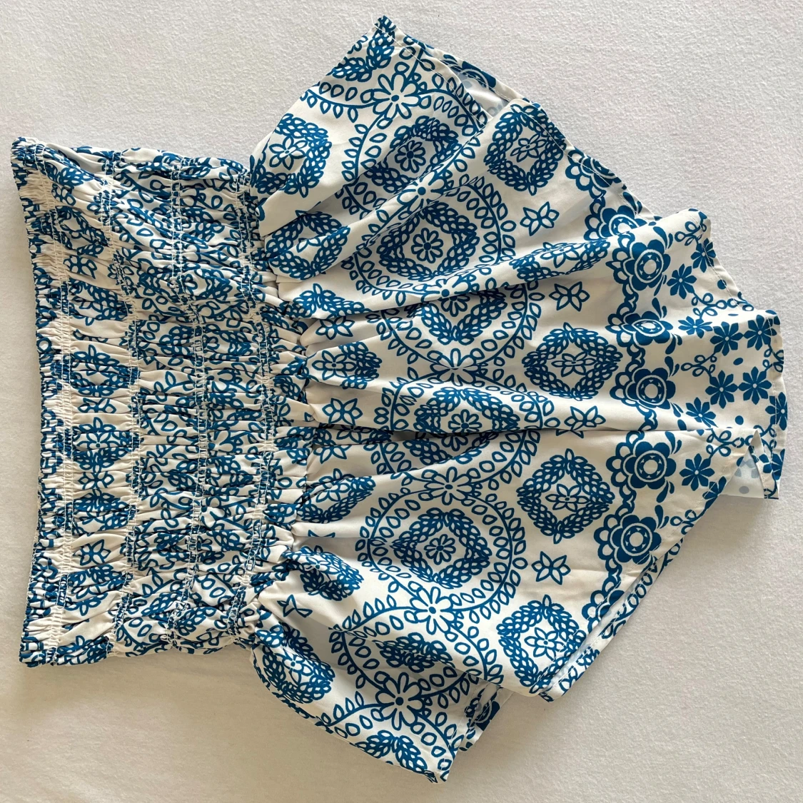 Supersöt bandeau tubtopp i vitt med blått blommigt mönster. Toppen har smock upptill för en skön passform och volangig nederdel som ger en luftig känsla. Perfekt till sommaren och lätt att matcha med jeansshorts. Kan även användas som kjol, bara använt ett par gånger men köpte second hand så vet inte var den är från. Trots att den är second hand är den i väldigt bra skick🩷