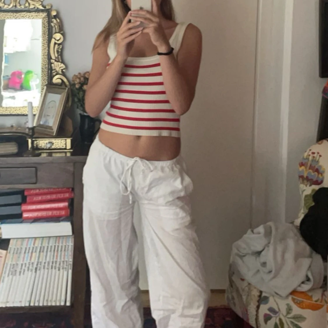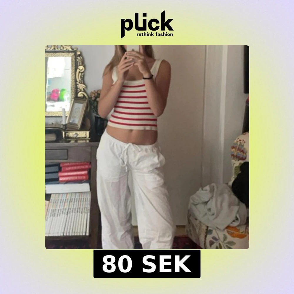 Säljer en söt stickad linnetopp med breda röda och vita ränder. Toppen är ärmlös och har en croppad passform, perfekt för varma dagar. Enkel och stilren design som passar till mycket.