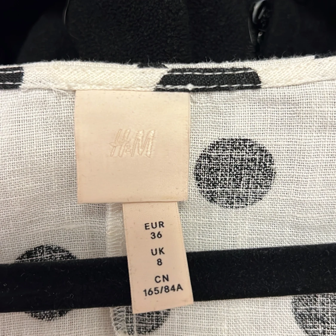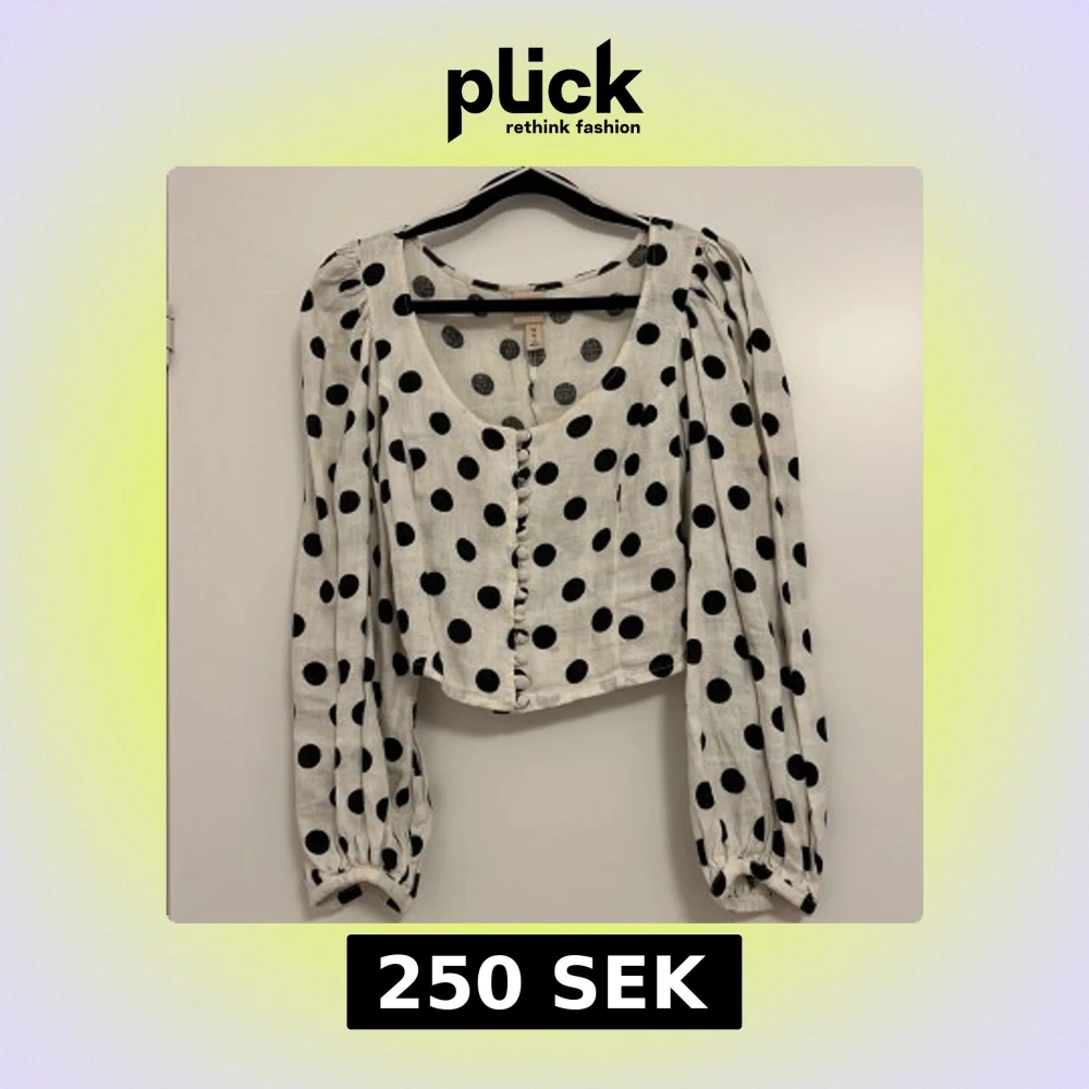 Säljer en söt vit blus med svarta prickar från H&M. Blusen har långa ärmar och knappar framtill. Perfekt för en stilren och lekfull look.