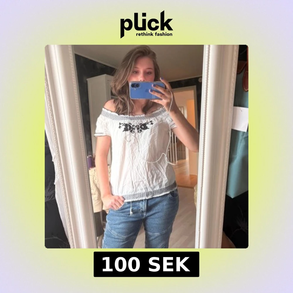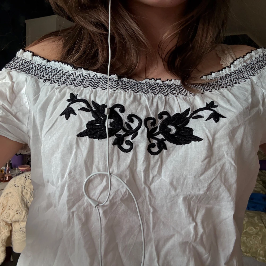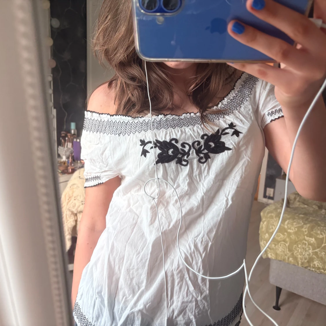 Säljer en vit offshoulder blus med svart broderat blommönster framtill. Blusen har smockad kant upptill och nertill samt korta ärmar med broderad detalj.