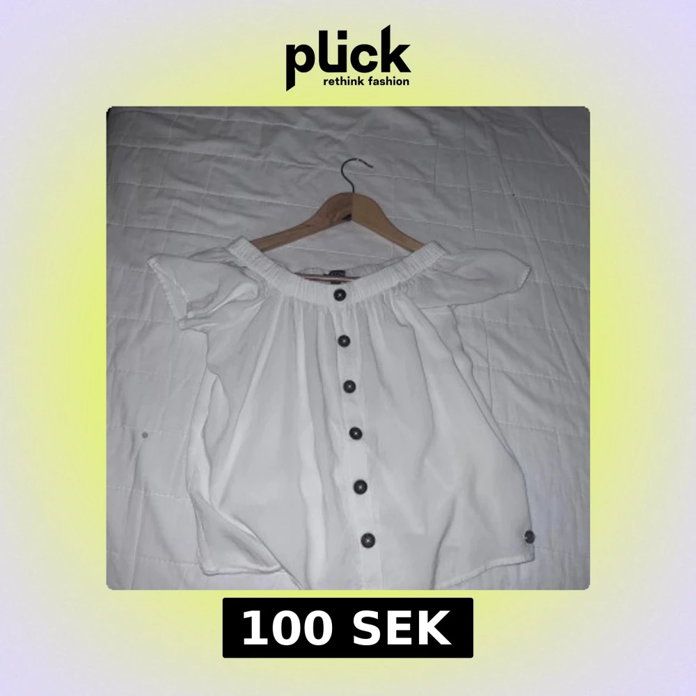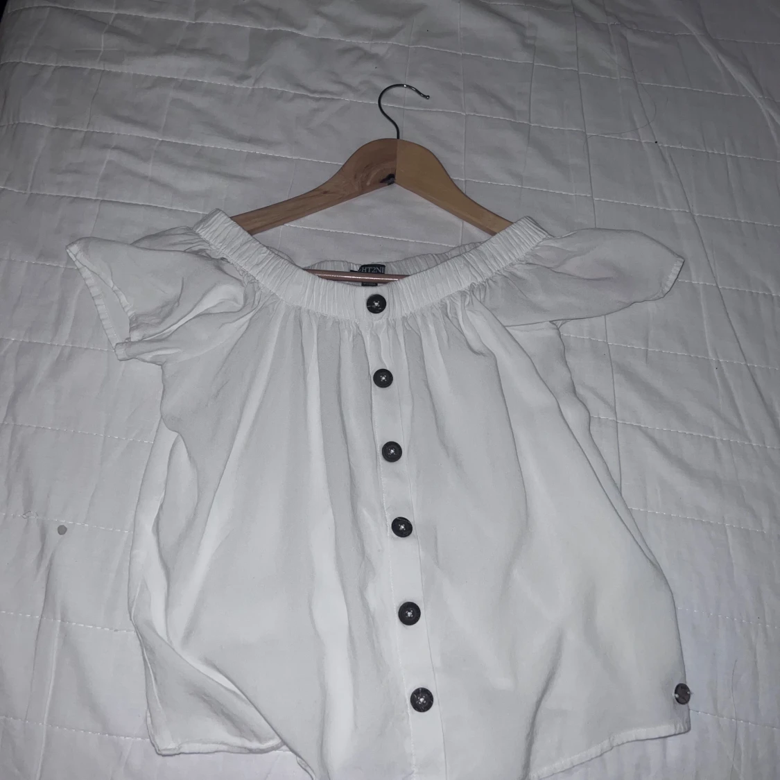 Säljer en söt vit offshoulder blus med svarta knappar framtill. Blusen har korta ärmar och en bred resår vid axlarna som ger en snygg passform. Perfekt till sommaren!