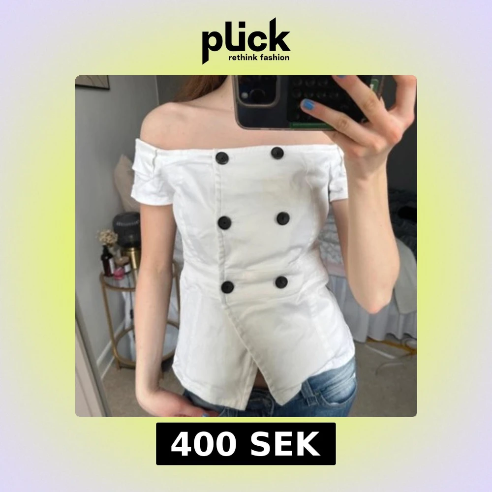 Snygg vit offshoulder blus med svarta knappar framtill. I demin material