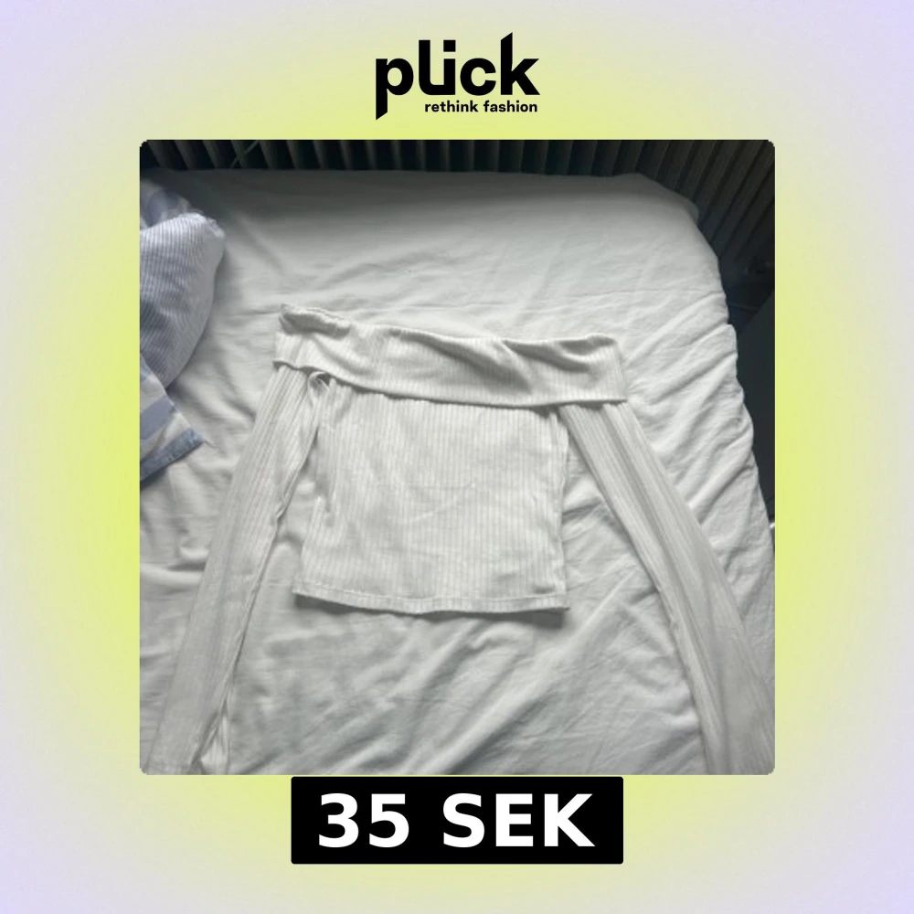 Säljer en vit ribbad offshoulder topp från H&M Divided i storlek XS. Toppen har långa ärmar och en bred kant upptill som sitter snyggt över axlarna. Perfekt att styla med jeans eller kjol för en trendig look.