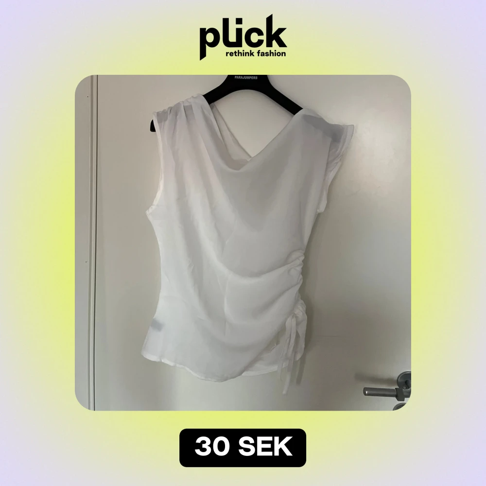 Säljer en stilren vit omlottopp i ett lätt och luftigt material. Toppen är off shoulder på ena sidan, vilket gör den perfekt för varma sommardagar. Den har en snygg knytdetalj på sidan som ger en fin passform. Perfekt för både vardag och fest!