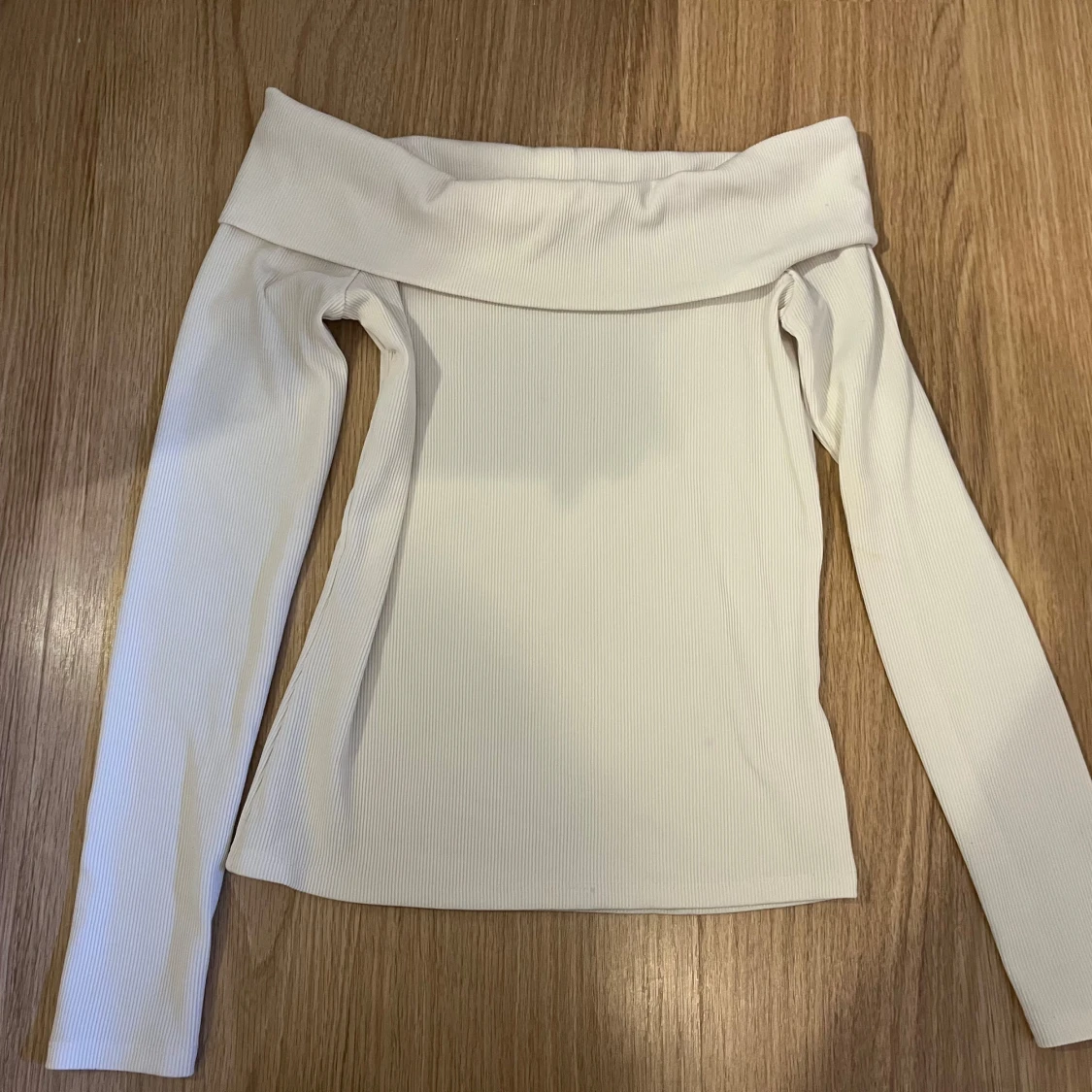 Säljer en stilren vit offshoulder topp med långa ärmar och ribbad struktur. Toppen har en bred, vikt kant upptill som ger en snygg och modern look. Perfekt för dig som gillar minimalistisk och trendig stil. Den är från hm.