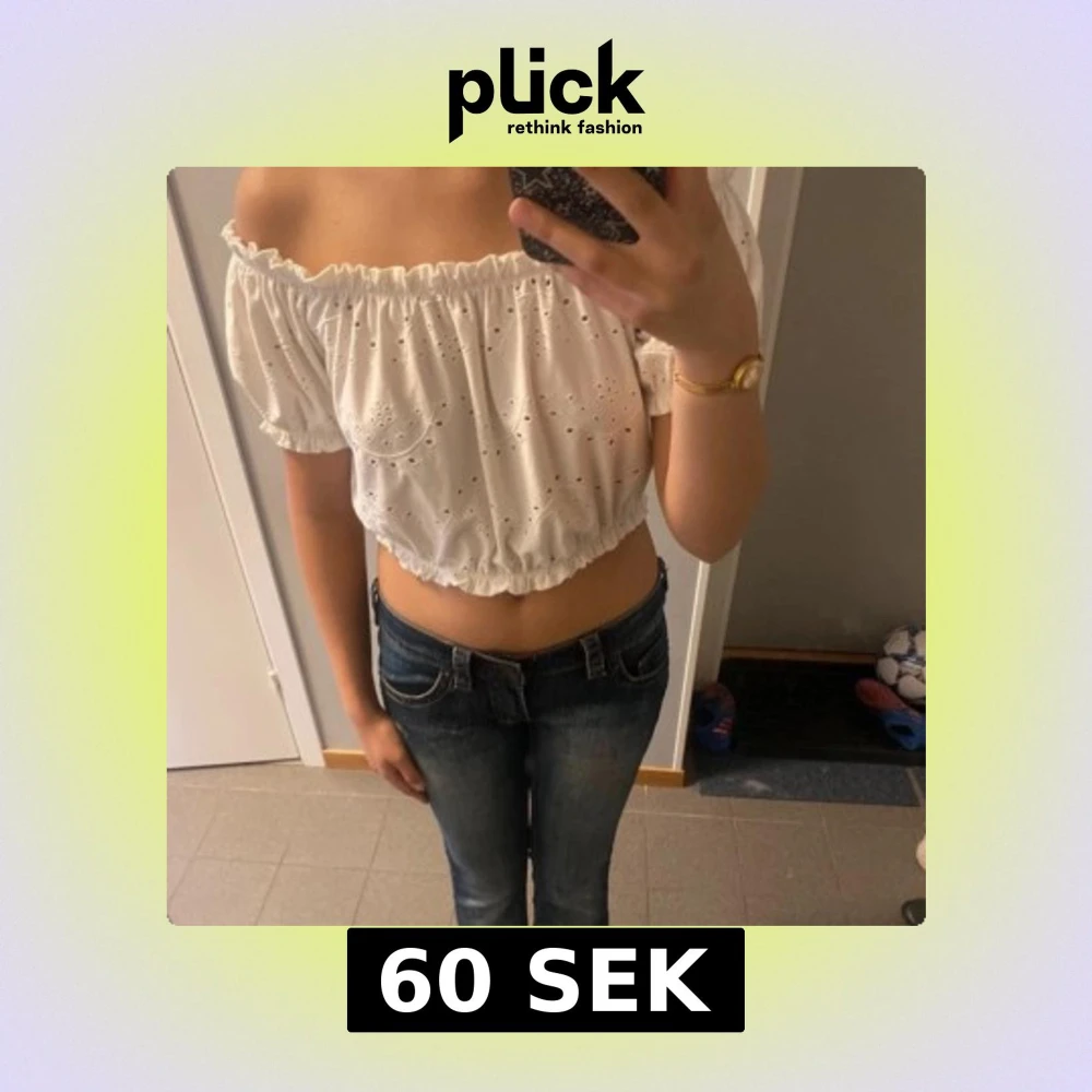Söt vit offshoulder topp med broderade detaljer och korta ärmar. Den har ett elastiskt band vid axlarna för en bekväm passform.
