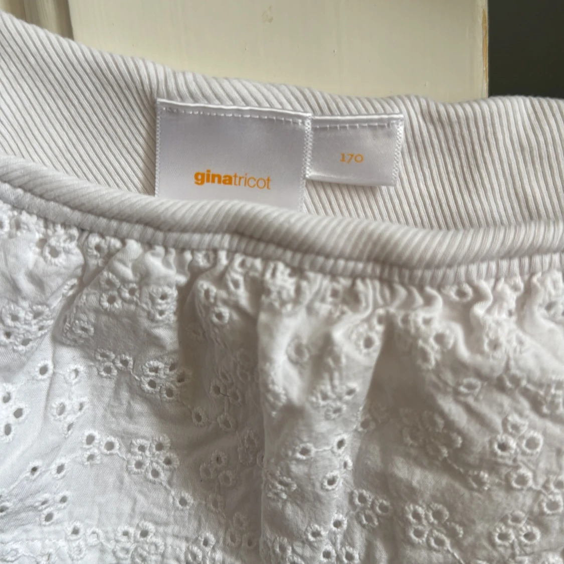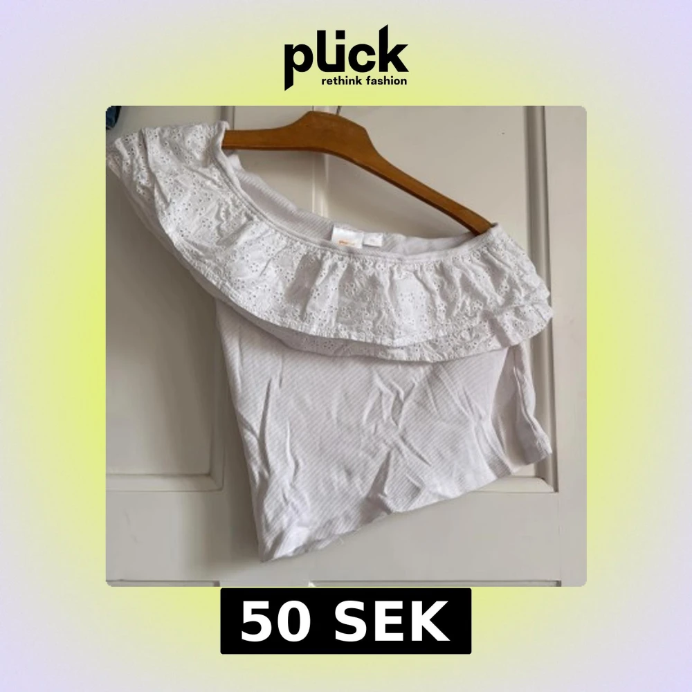 Superfin vit offshoulder topp från Gina Tricot med bred volangkant i broderad spets och ribbad bomull. Toppen är ärmlös och har en romantisk vibe med blommiga detaljer på volangen. Perfekt för sommarens alla tillfällen!