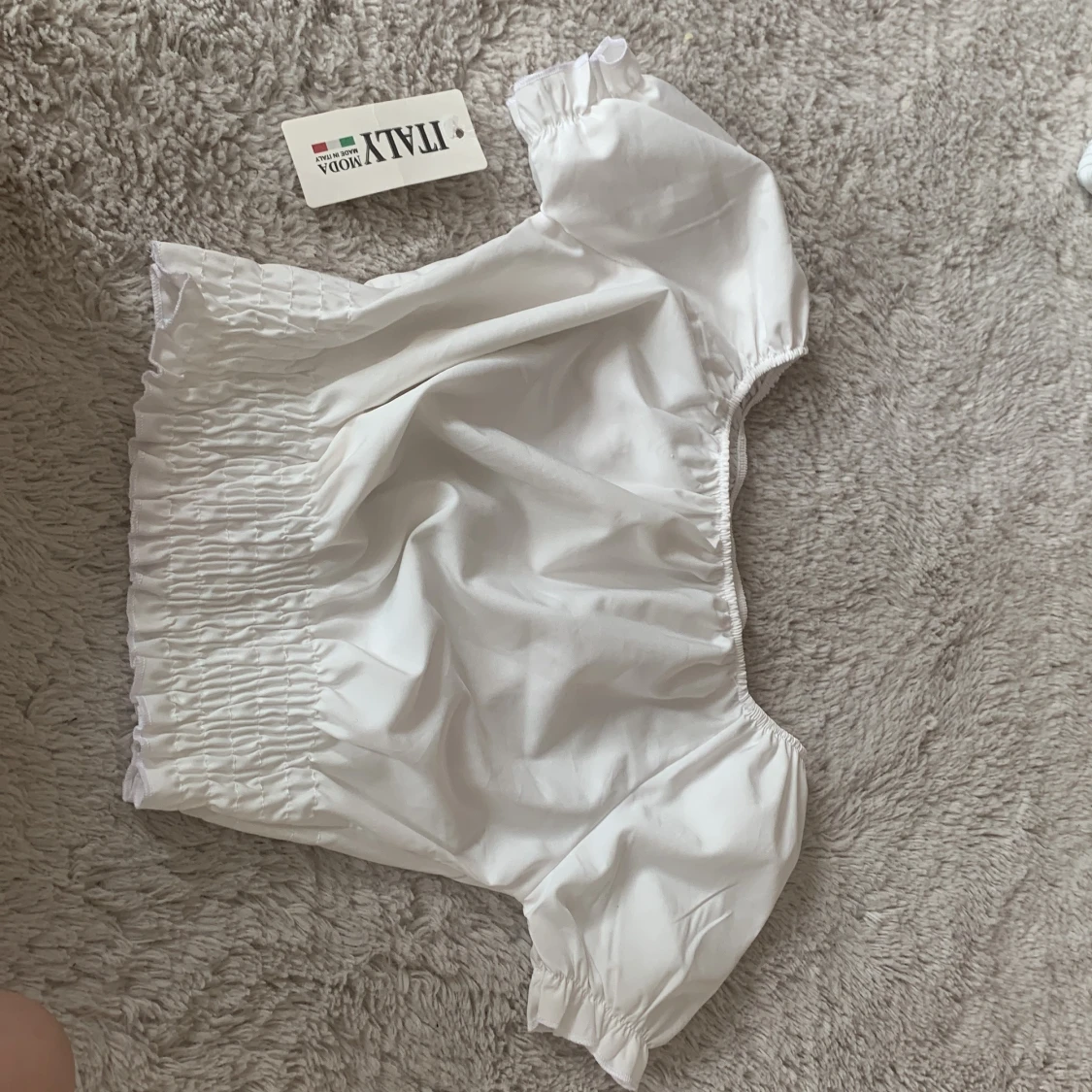 Supersöt vit offshoulder topp från ITALY MODA med smockad midja och kort puffärm. Perfekt för dig som gillar romantisk och trendig stil. Tunn och luftig bomull som känns fräsch och somrig. Säljes med tag kvar!