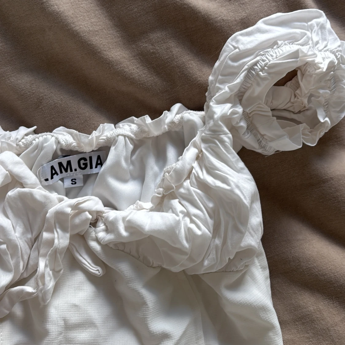 Supersöt vit offshoulder topp från I.AM.GIA med puffiga ärmar och knytdetalj framtill. Toppen har en romantisk känsla med rynkade detaljer och sitter snyggt över bysten. Perfekt att styla med jeans eller kjol.