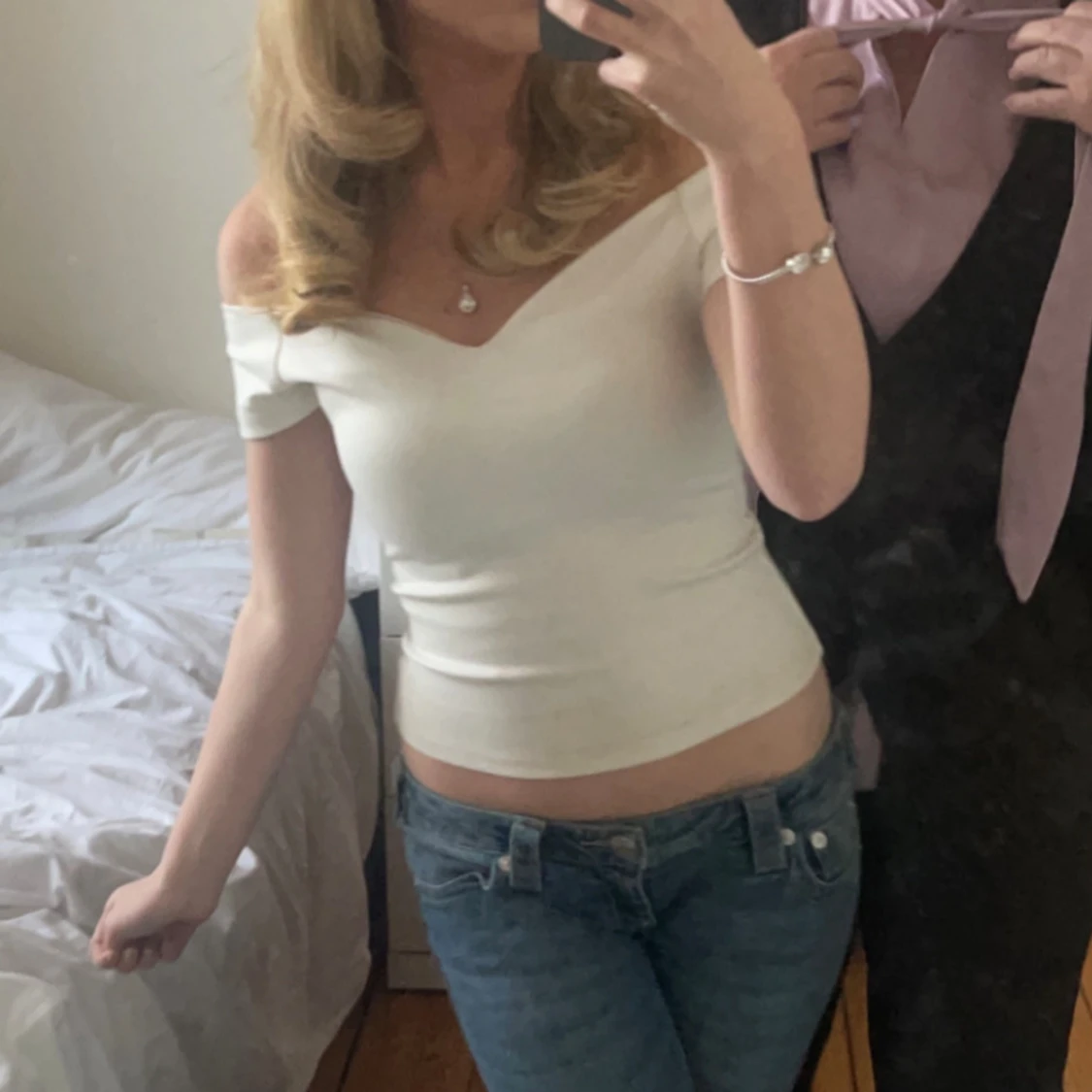 Säljer en vit, tight offshoulder topp med snygg v-ringning. Toppen är croppad och har korta ärmar som sitter precis under axlarna. Perfekt för dig som gillar en enkel men stilren look. Materialet känns mjukt och stretchigt, troligen bomull eller polyester.