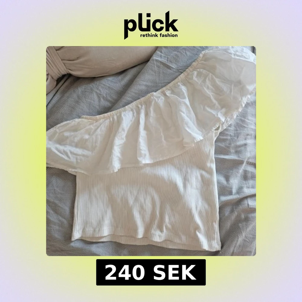 Säljer en superfin vit offshoulder topp med bred volang runt axlarna. Från zara tror jag strl S. Lite sminkfläckar längst upp (2a bild) men går såklart fort i tvätten🥰