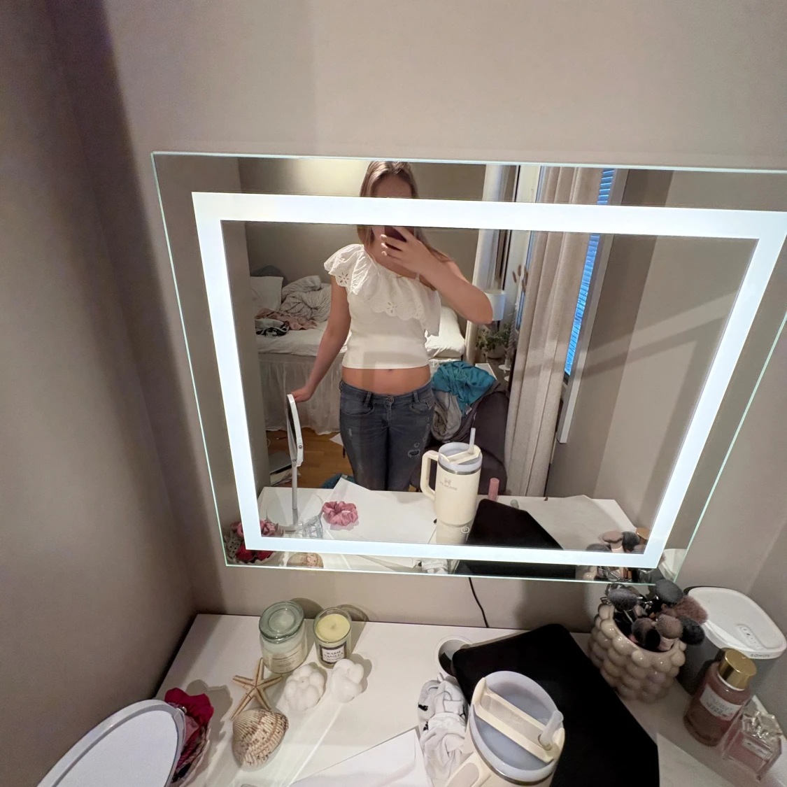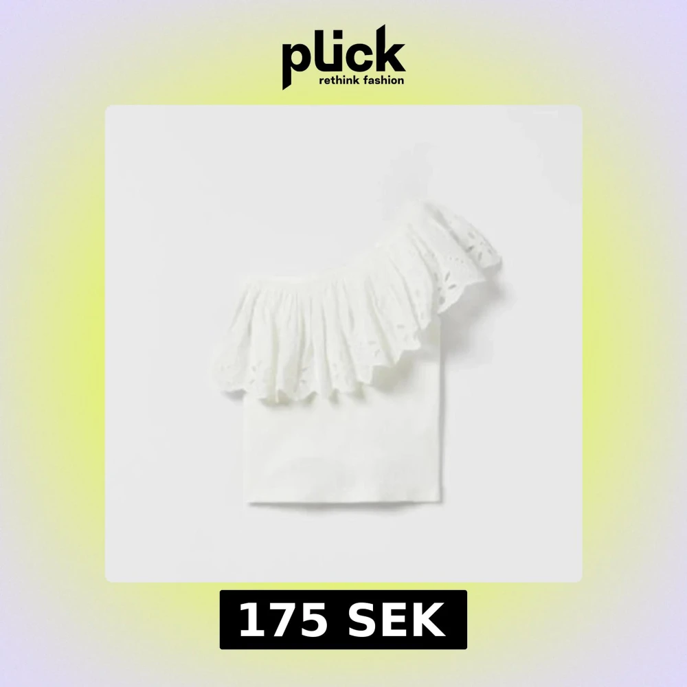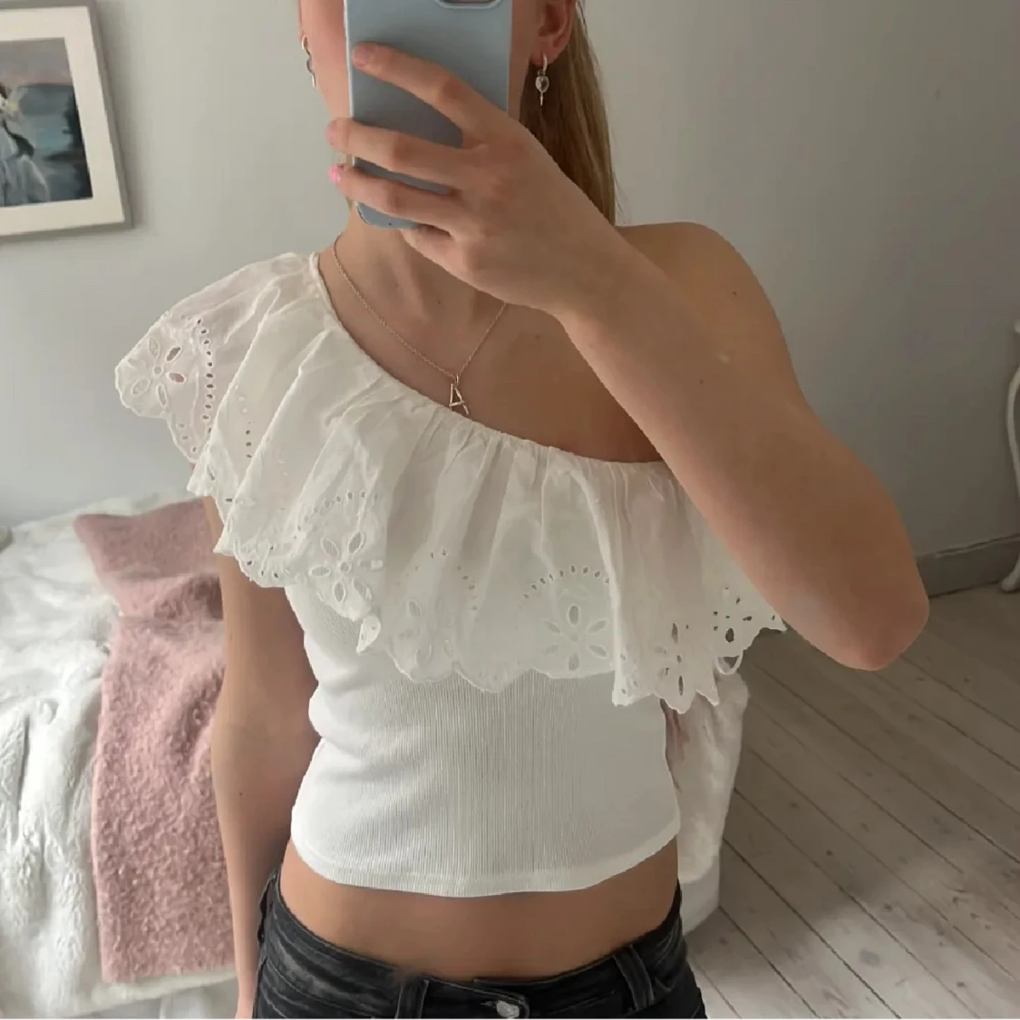 Superfin vit offshoulder topp med bred volang och broderade detaljer. Toppen är croppad och har en axel bar, vilket ger en snygg och trendig look. Perfekt till jeans eller kjol för en fräsch sommarstil. Storken är 164 13-14 år men skulle nog passa s-xs