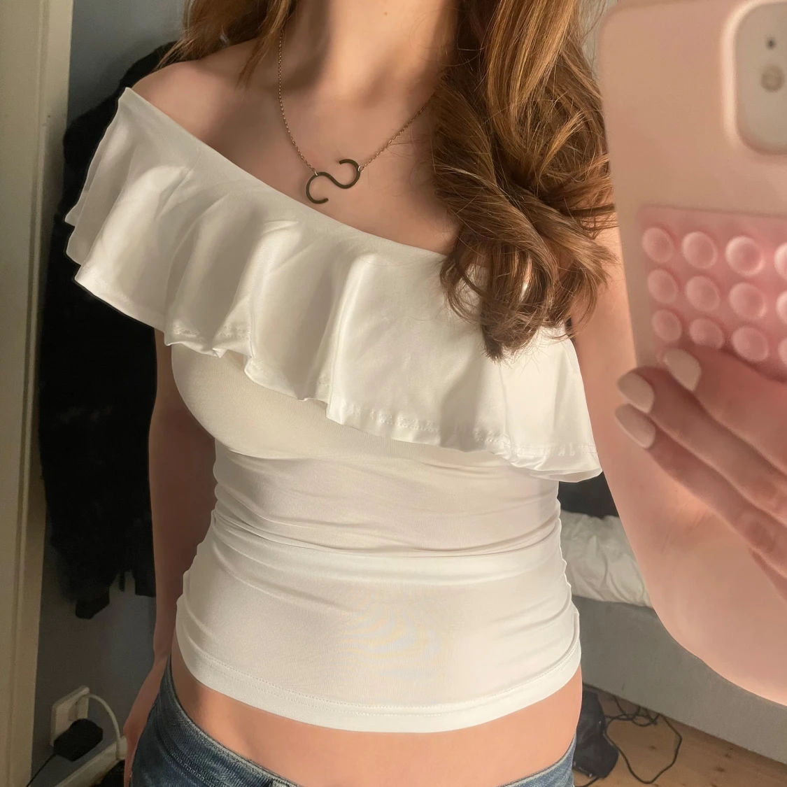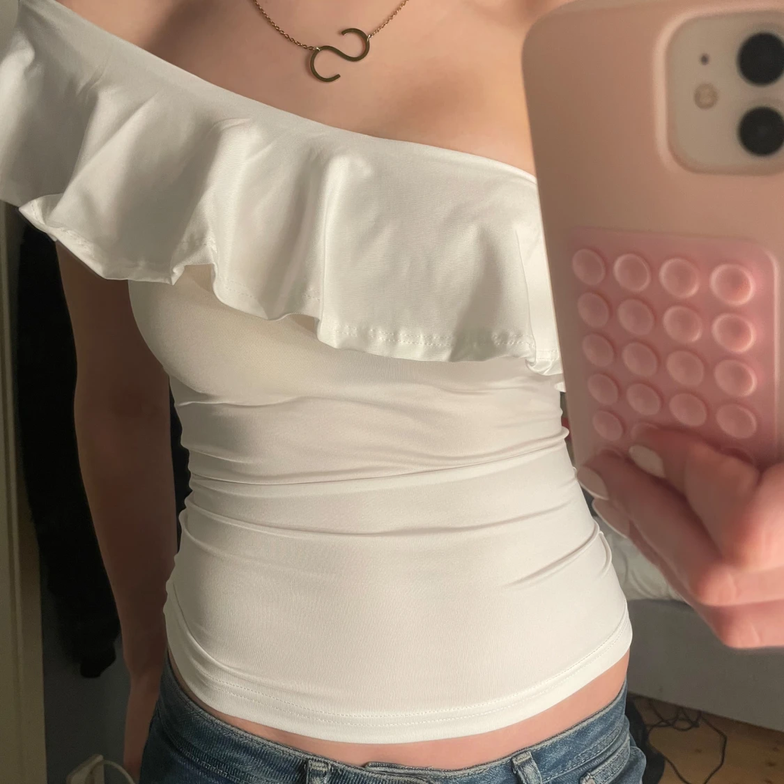 vit offshoulder tröja med volang! Aldrig använd då jag beställde två🥰