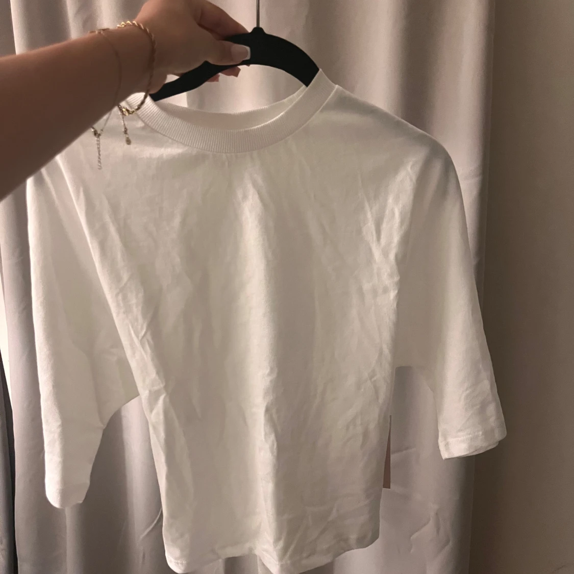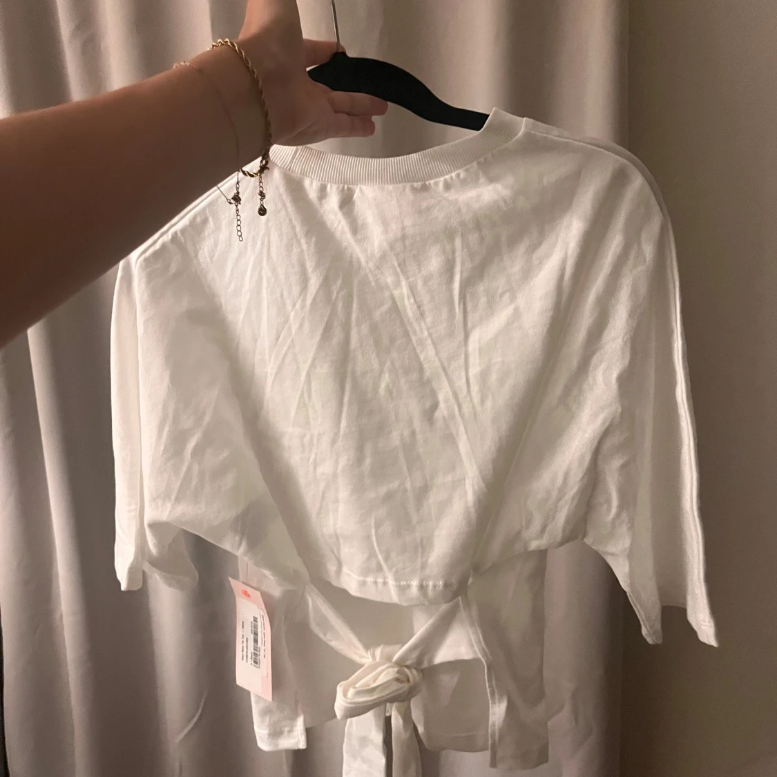 Säljer en vit kortärmad topp i bomull med rund halsringning och snygg knytning baktill. Enkel och clean design som passar perfekt till jeans eller kjol. Oversized fit för en avslappnad vibe. Prislapp kvar