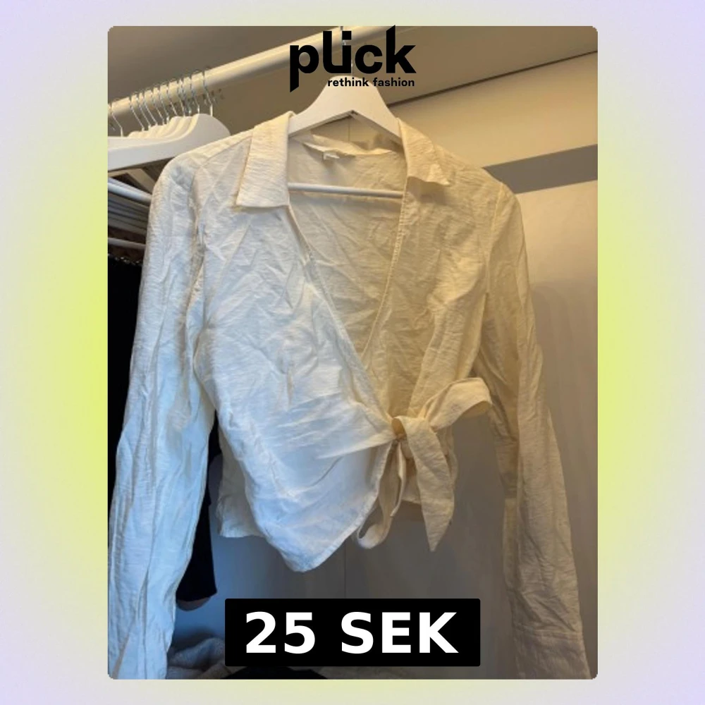 Säljer en stilren vit omlottblus från H&M i storlek S. Blusen har lång ärm, klassisk krage och knyt i sidan för en snygg passform. Materialet är lätt och känns skönt mot huden, perfekt för dig som gillar en clean och fräsch look.