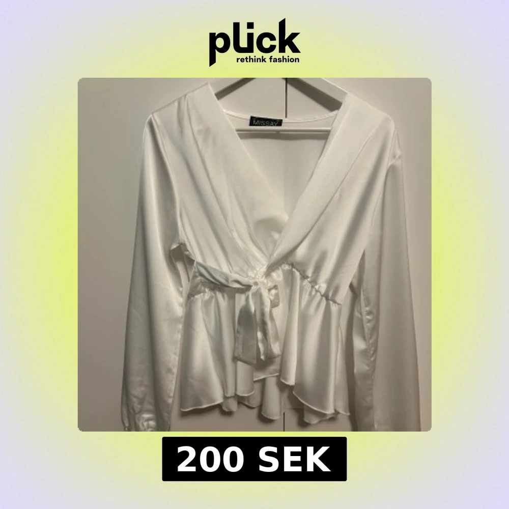 Säljer en vit omlottblus från Missay i glansigt material. Blusen har långa ärmar, volang nertill och knyt i midjan för en snygg siluett. Perfekt för dig som gillar feminina detaljer och stilren look.